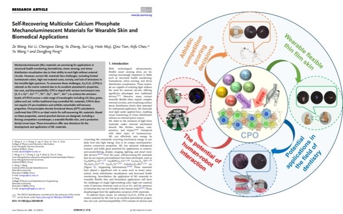 beat365官网朝克夫教授团队与深圳大学王瑀、彭登峰教授团队合作开发出一类低成本、可多色发射、环境友好且生物兼容的Ca₂P₂O₇基应力发光材料。该系列材料可在紫外至红光的宽光谱范围内发光,并在多次机械加载循环中保持稳定的发光强度与自恢复特性。研究利用第一性原理计算发现,该材料的纵向压电系数d₃₃高达24.90 pc/N,结合实验验证,揭示了其应力发光机理为内建压电场与外部摩擦电场协同作用的结果。由于其发光强度与机械应力呈线性关系,该材料在应力传感和运动监测中具有重要应用价值。团队将Ca₂P₂O₇: X材料与柔性聚二甲基硅氧烷(PDMS)、环氧树脂以及仿真牙科材料相结合,成功制备了多种柔性可穿戴传感器与生物器件原型。在人体接触与人工唾液浸泡30天的生物安全性测试中,仅检测到少量Ca、P元素,未检出有害元素,进一步证明了其在可穿戴皮肤、运动防护及口腔修复等生物医疗场景中的应用前景。