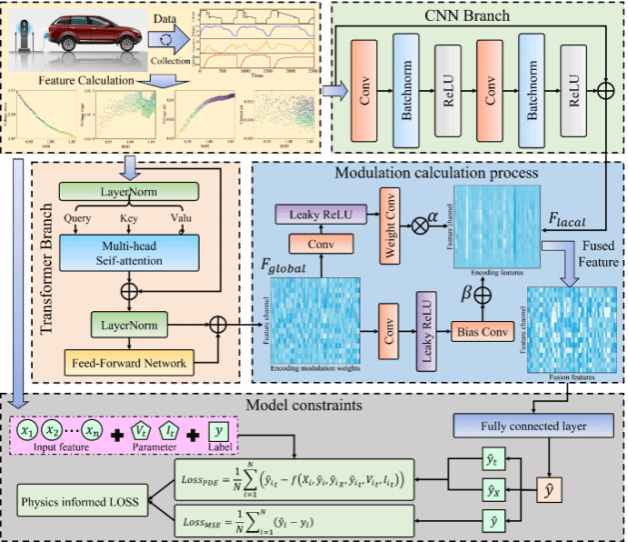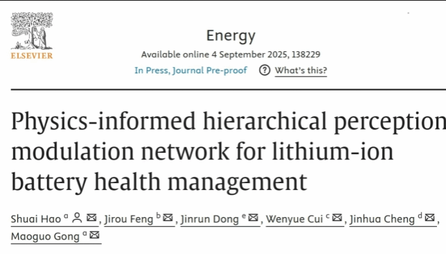 团队成员郝帅博士在能源领域的一区Top期刊《Energy》上发表题为《Physics-informed Hierarchical Perception Modulation Network for Lithium-ion Battery Health Management》的研究成果。该研究围绕复杂工况下电池健康状态评估准确性与鲁棒性难题,提出了物理约束层次感知调制网络,实现了对电池退化动力学的精准建模与电池健康状态高精度预测,在多变温度、载荷与充放电策略条件下表现出更强的泛化能力与稳定性。该方法实现了双分支协同框架,局部分支采用卷积神经网络提取细粒度电化学表征,捕获循环内快速变化的微结构信息;全局分支引入Transformer建模长程时序依赖,刻画跨循环的容量衰退轨迹。两分支通过“退化感知”调制机制耦合,使全局退化上下文自适应调制局部特征提取,动态平衡局部敏感性与全局一致性。同时设计物理约束损失,将离散状态空间退化方程嵌入学习过程,以物理先验规范参数更新,减轻仅凭数据驱动带来的不确定性。经过系统评测,物理约束层次感知调制网络在预测精度与跨工况泛化方面均优于现有代表性方法,有限数据场景下仍保持稳健表现。该成果为电动汽车电池管理系统提供可落地的电池健康状态在线估计方案,可服务车辆安全预警与运维决策,并对储能系统寿命评估、预测性维护等应用具有重要价值。
