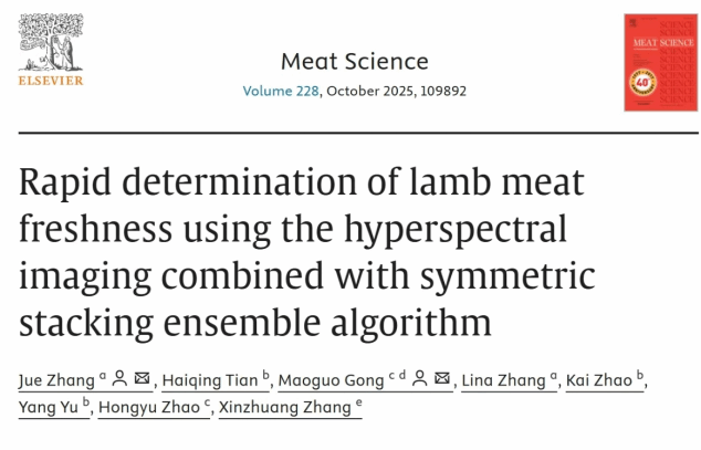 团队成员张珏博士在畜牧业领域的一区Top期刊《Meat Science》上发表题为《Rapid determination of lamb meat freshness using the hyperspectral imaging combined with symmetric stacking ensemble algorithm》的研究成果。该研究面向肉类高光谱成像智能分析的两大难点开展攻关,在保持组织结构完整的前提下实现羊肉新鲜度的可靠无损检测,并在多指标融合建模中提升可解释性与生物学关联性。该研究将高光谱成像与人工智能深度融合,提出了关键波段自适应提取与多模型特征融合机制,构建了对称堆叠集成学习框架SSEL,发现了 620 至 630 nm 光谱峰值红移与肌红蛋白 OxyMb 向高铁肌红蛋白 MetMb 转变密切相关,该区域具有重要生物标志潜力,可用作评估储存期间羊肉腐败程度的关键特征波段。SSEL 集成学习架构融合多类基学习器与元学习器,缓解高维高光谱数据的欠拟合与过拟合问题,在 TVB-N、TVC、pH、L* 等新鲜度指标预测中,R² 提升约 5% 至 12%,RMSEP 降低约 15% 至 28%,整体性能优于传统单一建模方法。同时提出融合光谱动态变化与理化指标的双通道时间序列建模策略,并引入基于多目标优化的储存时间预测机制,实现对羊肉储存周期的准确评估。该技术贯通数据采集、特征波段自适应提取、集成建模与分子机制层面的可解释性分析,在肉类质量安全监测、冷链运输管理、智能包装检测与食品溯源等场景具有显著应用价值。