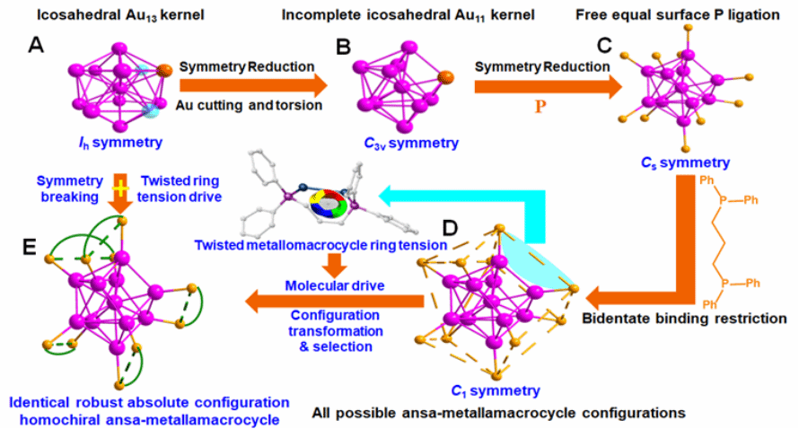 其关键机制在于双齿 dppp 配体在 Au11 核心外层形成张力结构的 ansa-金属大环(Au–P–CH2CH2CH2–P–Au 桥联),这种空间约束打破了簇核的固有对称性,从而赋予其手性结构。单晶衍射进一步确认了该簇的原子结构,并排除了反演或镜像对称性的存在。