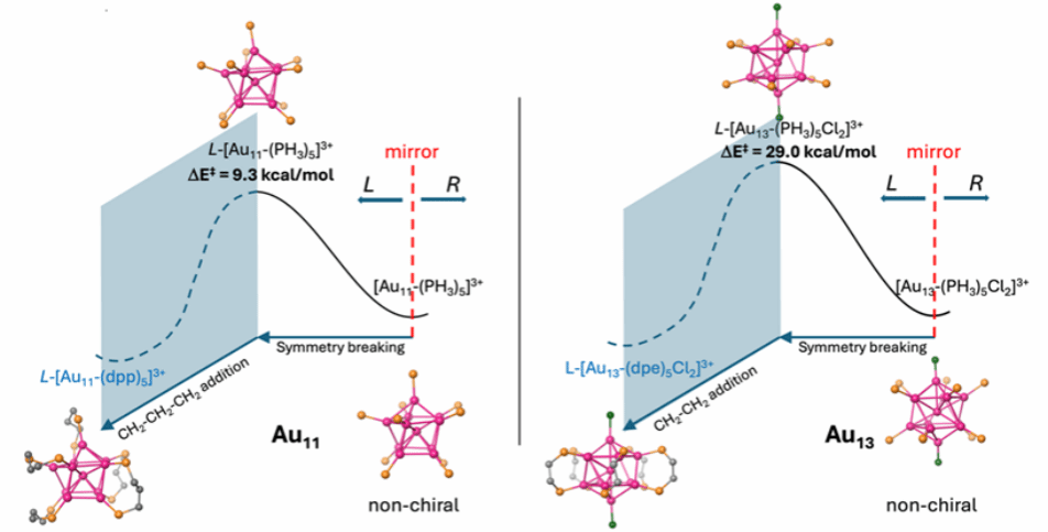 密度泛函理论(DFT)计算进一步揭示,该 Au11 簇发生对称性破缺变形的能垒仅为 9.3 kcal/mol,这一过程由丙烷桥的理想匹配性所促进,从而解释了为何 Au11 能直接形成单一对映体,而结构类似的 Au13 簇则倾向于消旋化。