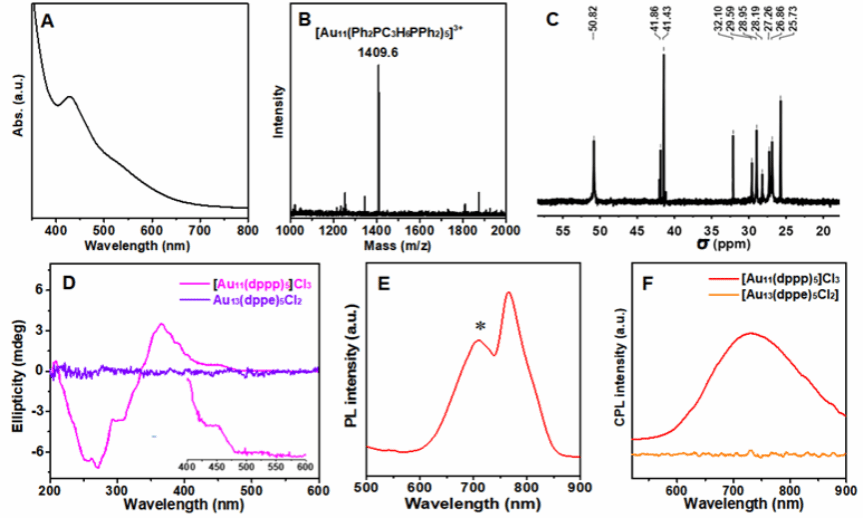 通过无手性 1,3-双(二苯基膦基)丙烷(dppp)配体直接合成出手性纯的 Au₁₁ 纳米簇。40在纳米技术领域,实现具有原子精度的金属纳米簇的纯对映体仍是一大难题。常规合成方法往往会生成外消旋混合物,需要复杂的后续分离。然而,单一手性纳米材料在手性传感、不对称催化以及圆偏振发光(CPL)等方面具有重要应用。尽管目前的策略多依赖手性配体或后合成拆分,但直接由无手性组分合成对映体单一手性金属纳米簇的报道较为稀少,并科学意义重大。