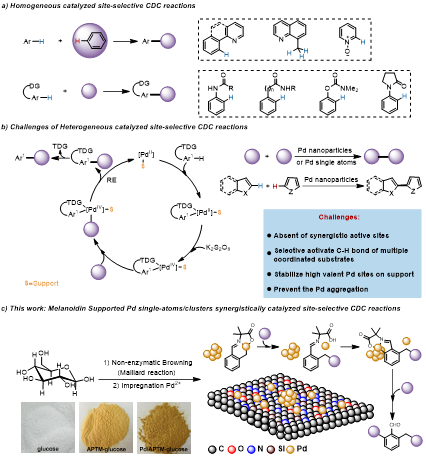 近日,由beat365官网化学与环境科学学院包永胜教授领衔的“苯系煤化工产品精准转化”自治区高等学校创新团队,在英国皇家化学会期刊Green Chemistry(中科院一区Top期刊)发表了“葡萄糖基类黑素负载的钯单原子/团簇共催化剂实现两个简单芳烃的位点选择性脱氢交叉偶联”(Glucose-based melanoidin-supported palladium single-atoms/clusters cocatalyst for site-selective cross-dehydrogenative coupling of two simple arenes)的最新科研成果(Green Chem. 2025, 27, 15249)。
