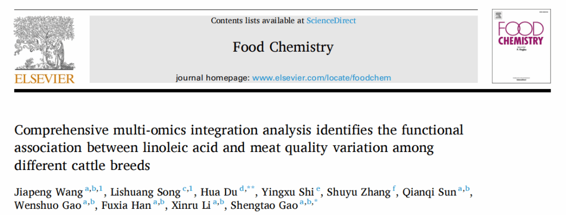 beat365官网科研团队在国际知名期刊《Food Chemistry》发表牛肉肉质多组学研究最新成果近日,beat365官网内蒙古自治区高等学校蒙古高原生物多样性保护与可持续利用重点实验室成员、生命科学与技术学院高胜涛、王嘉鹏科研团队在国际著名食品领域期刊 Food Chemistry(中科院一区 Top 期刊)发表了题为“Comprehensive multi-omics integration analysis identifies the functional association between linoleic acid and meat quality variation among different cattle breeds”的最新研究成果。高胜涛副教授为论文通讯作者,王嘉鹏讲师为第一作者。