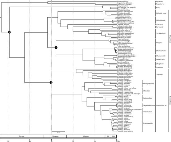 委陵菜族是蔷薇科16个族中最大的族,全球有1700余种,分属于13个属。近年来,随着分子标记的广泛应用,有关委陵菜族的组成和类群间关系的研究进展颇丰。然而,由于目前的系统发育研究主要基于有限的形态学信息与少数细胞器基因,科内众多族、属之间的关系尚不清晰。因此,亟需建立一个全面的属级水平的分化时间框架。对此,该团队与国内外同行开展合作,通过浅层基因组测序,获得了158份委陵菜族物种的质体序列,其中包含了委陵菜族中139个分类群,13个属。通过比对数据库公开数据,结合一系列生物信息技术,重新构建了委陵菜族的系统发育框架,为目前委陵菜族物种的分类提供了重要的参考依据。此外,该研究根据次级标定的分子钟估算,推断了委陵菜族的起源和分化时间,并分析了委陵菜族植物的多样化模式,为深入理解委陵菜族物种多样性和性状演变机制提供了新的见解。