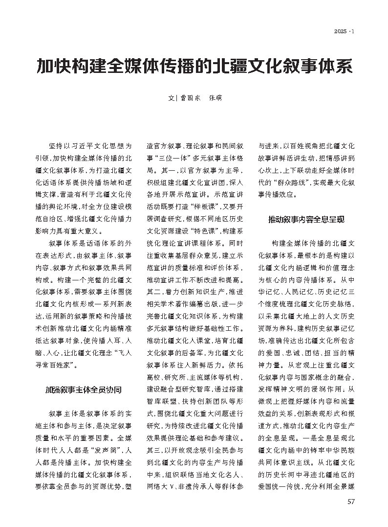 文章结合习近平总书记提出的“全媒体传播体系”重要论述,从全程媒体、全息媒体、全员媒体和全效媒体四个维度,对北疆文化传播的实践路径进行了深刻诠释。新时代的北疆文化传播秉持创新思维和系统理念,用全媒体方式掌握传播主动权,构建全链条、智能化、多维度叙事体系,着力提升传播效能,讲好中华民族共同体故事,展现中华文化的深厚底蕴,不断增强北疆文化传播力影响力,推动北疆文化走向世界。