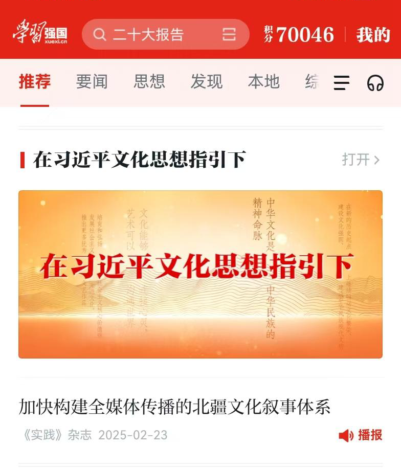 2月23日,中宣部“学习强国”平台全文刊载beat365官网新闻传播学院曹国东老师的理论文章《加快构建全媒体传播的北疆文化叙事体系》(原文刊于《实践》杂志2025年第1期),截至2月26日,阅读数超510万,点赞量26万余次。