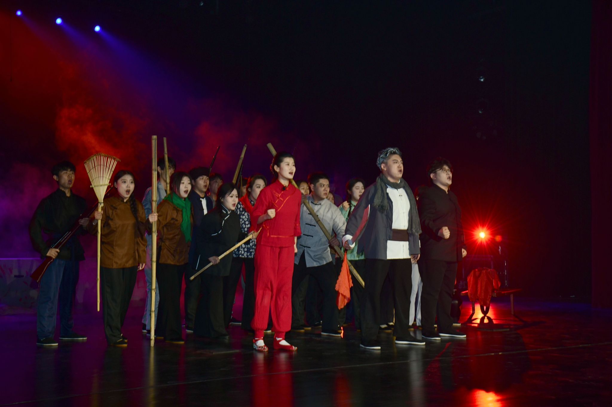 歌剧《沂蒙山》以抗日战争时期沂蒙山革命根据地的真实故事为背景,生动展现了军民水乳交融、生死与共的“沂蒙精神”。演出中,音乐学院师生以精湛的表演和深情的演唱,将剧中人物海棠、林生、夏荷等英雄形象刻画得淋漓尽致,再现了革命年代人民群众英勇抗战、无私奉献的感人故事。整场演出气势恢宏,音乐与剧情紧密结合,既有激昂的战斗场面,也有催人泪下的军民情深,赢得现场观众的热烈掌声。