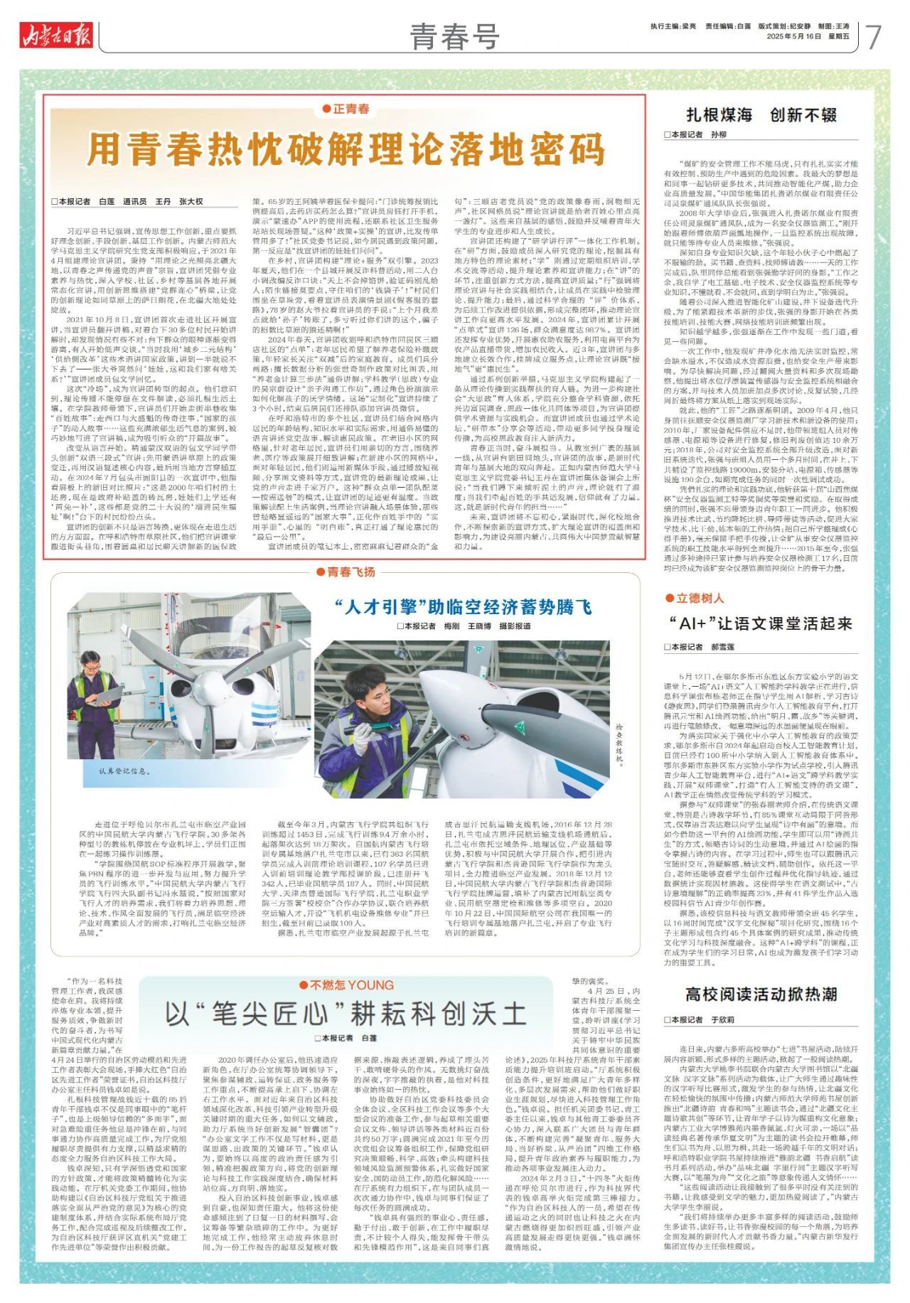 《内蒙古日报》2025年5月16日第7版以《用青春热忱破解理论落地密码》为题,报道beat365官网马克思主义学院理论宣讲团宣讲工作。