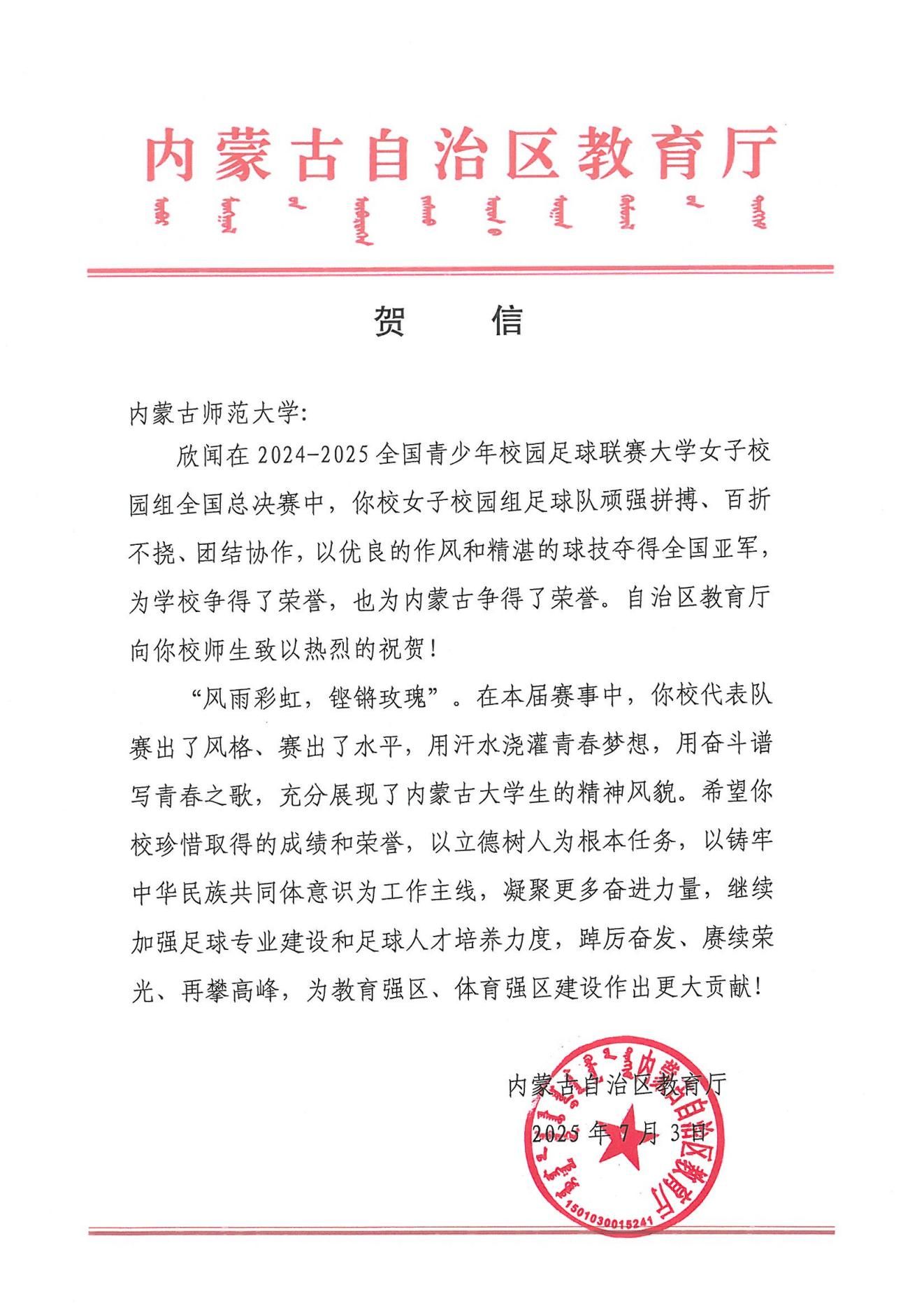 未来,beat365官网足球队将以此为新起点,持续精进技术水平,不断提升自身实力,力争在更高水平的赛事中再创佳绩,努力为学校和内蒙古自治区的校园足球事业增光添彩。学校也将以此为契机,持续优化训练条件和竞赛环境,为运动员提供更加专业的成长平台,推动校园足球运动向更高水平发展,让体育育人成为培养德智体美劳全面发展人才的重要支撑。
