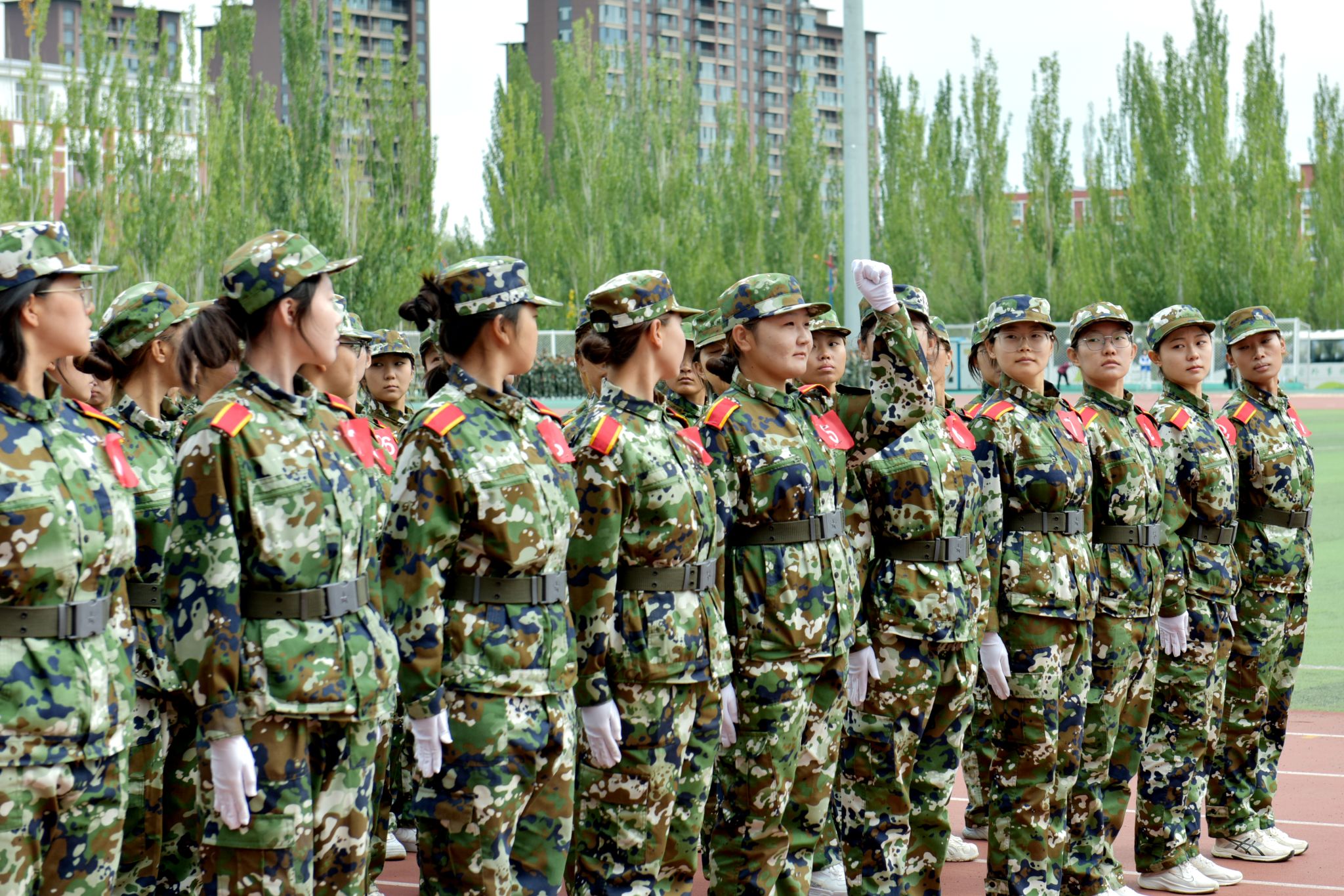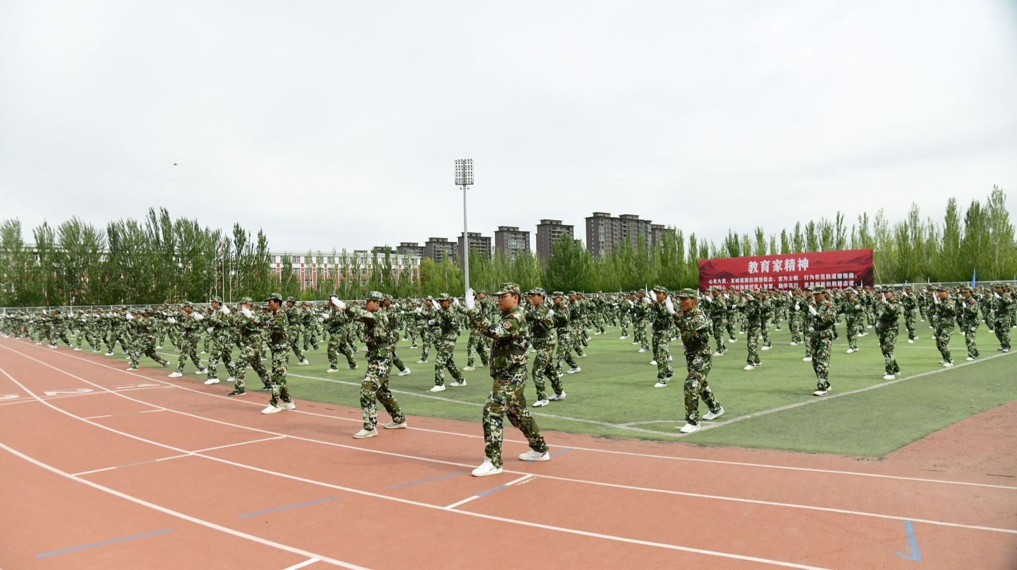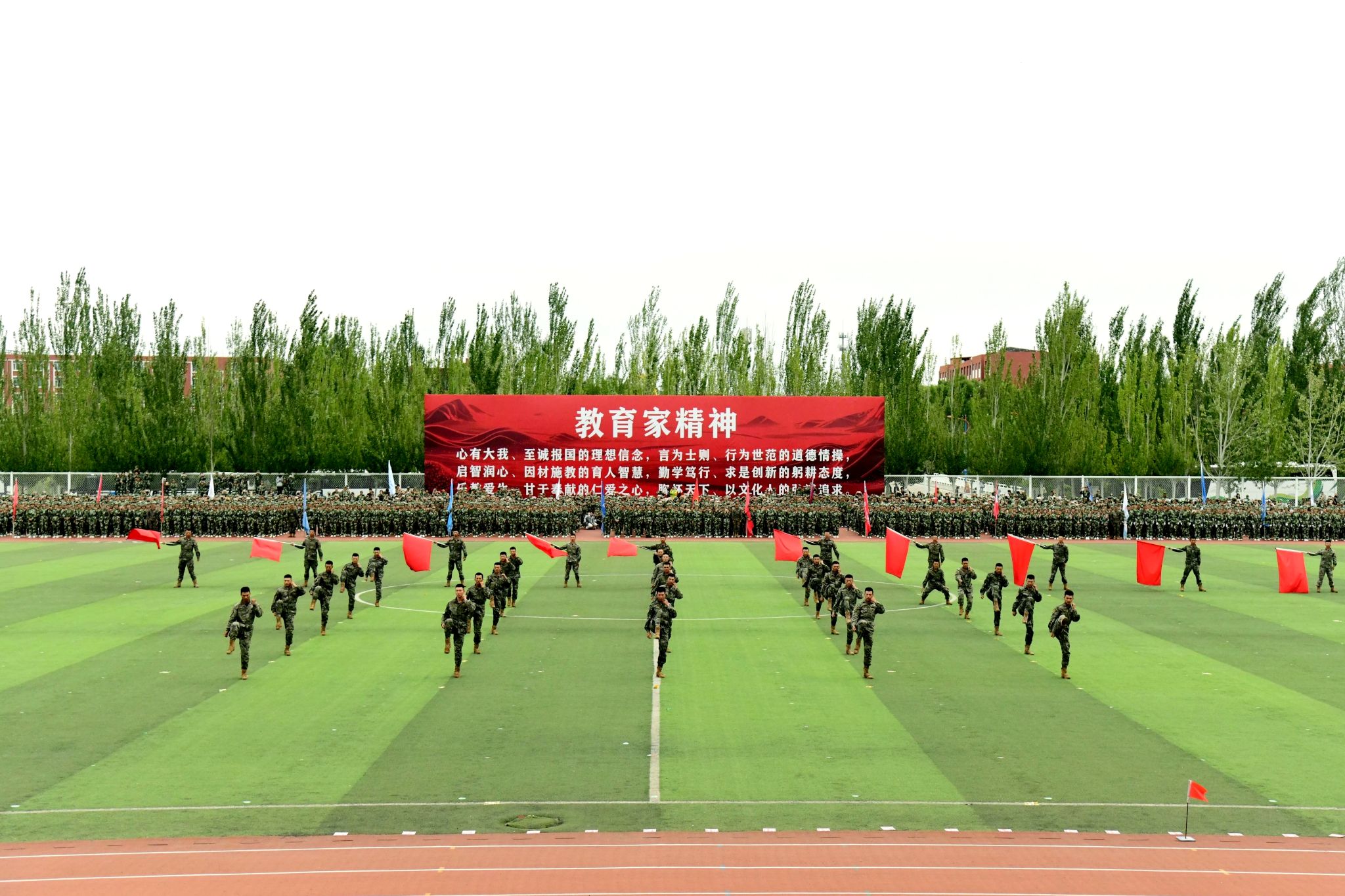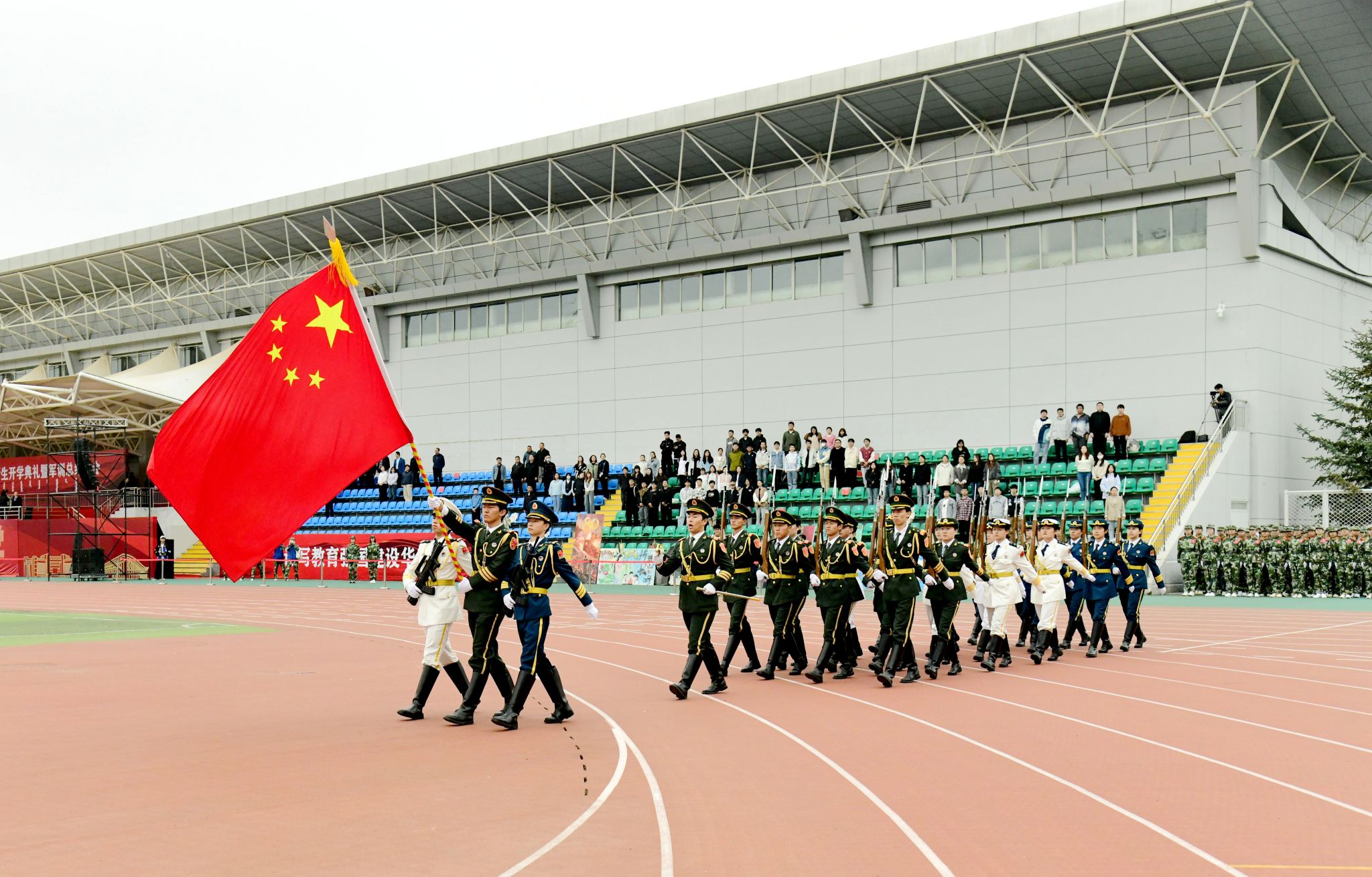 绿茵场上,军容严整;红旗招展,迎风猎猎。开学典礼在庄严的国歌声中拉开序幕,历经军训锤炼的新生更显坚毅。他们列队整齐,身姿挺拔,目光如炬,展现出青春的蓬勃力量与昂扬斗志。这一刻,汗水凝结为荣光,稚气蜕变为担当,崭新的大学篇章正以最铿锵的姿态书写开端。