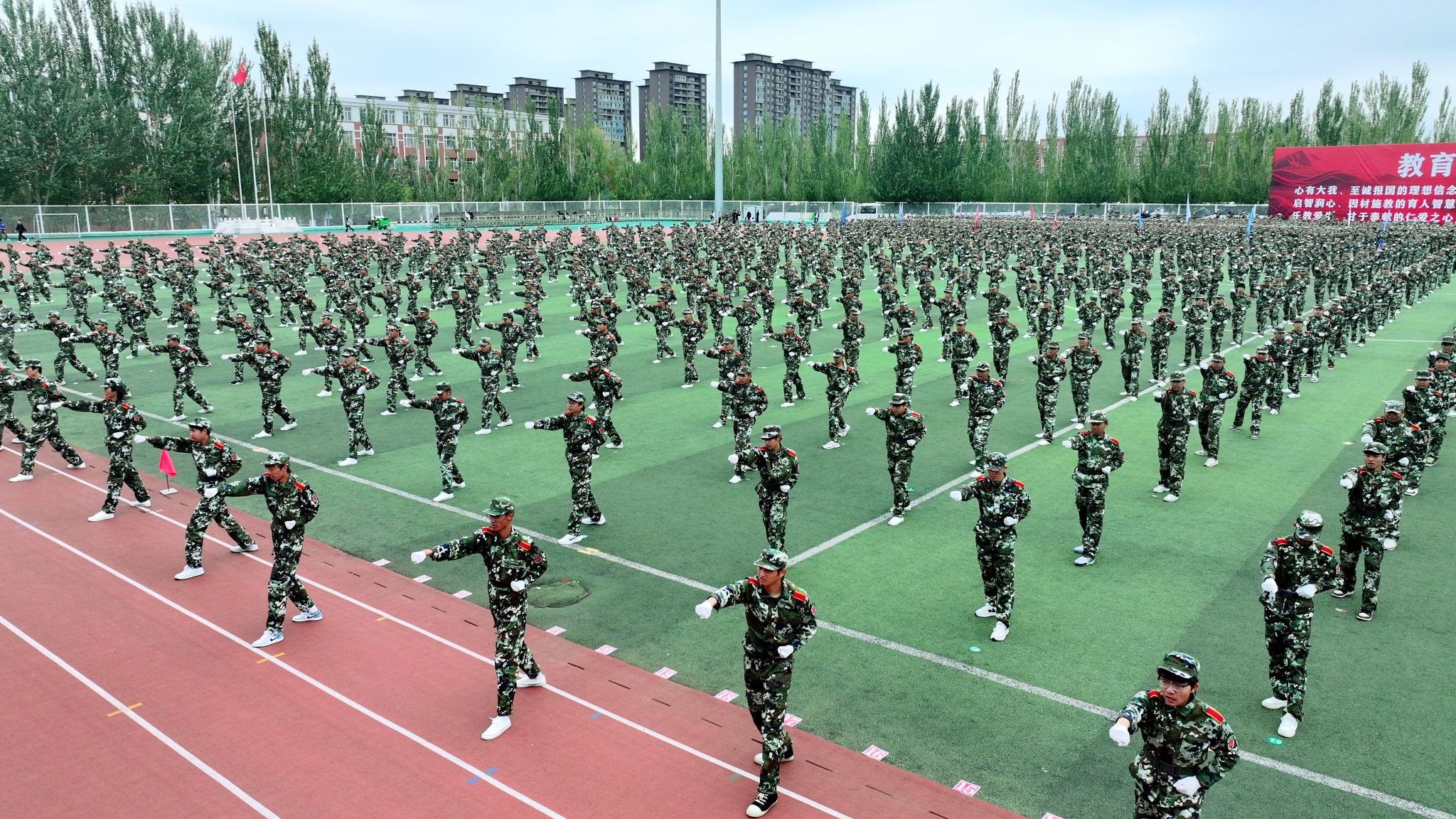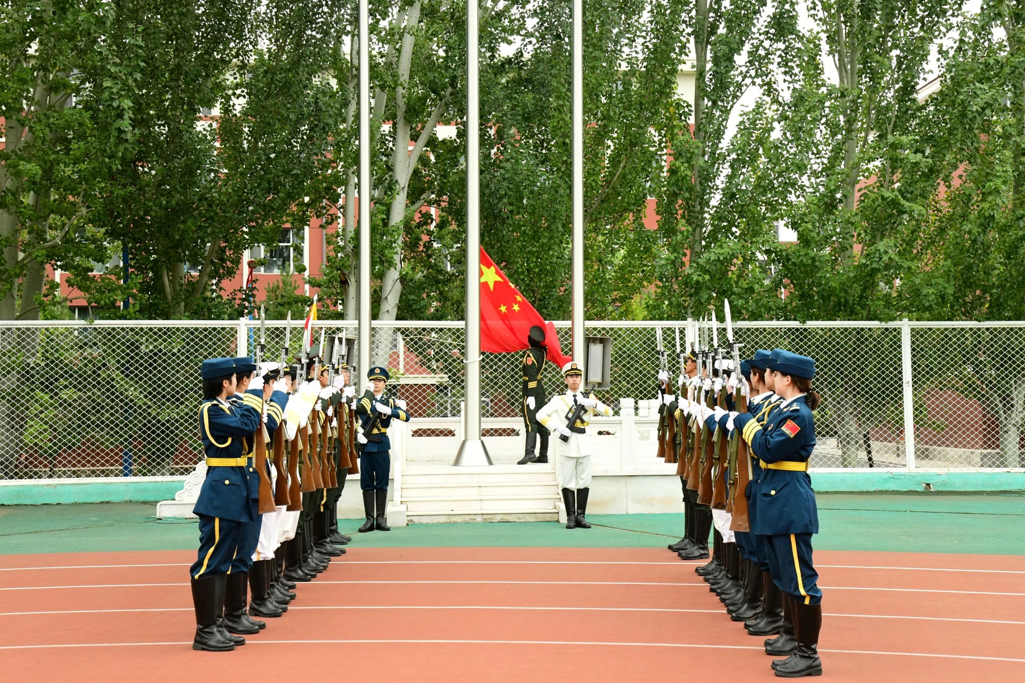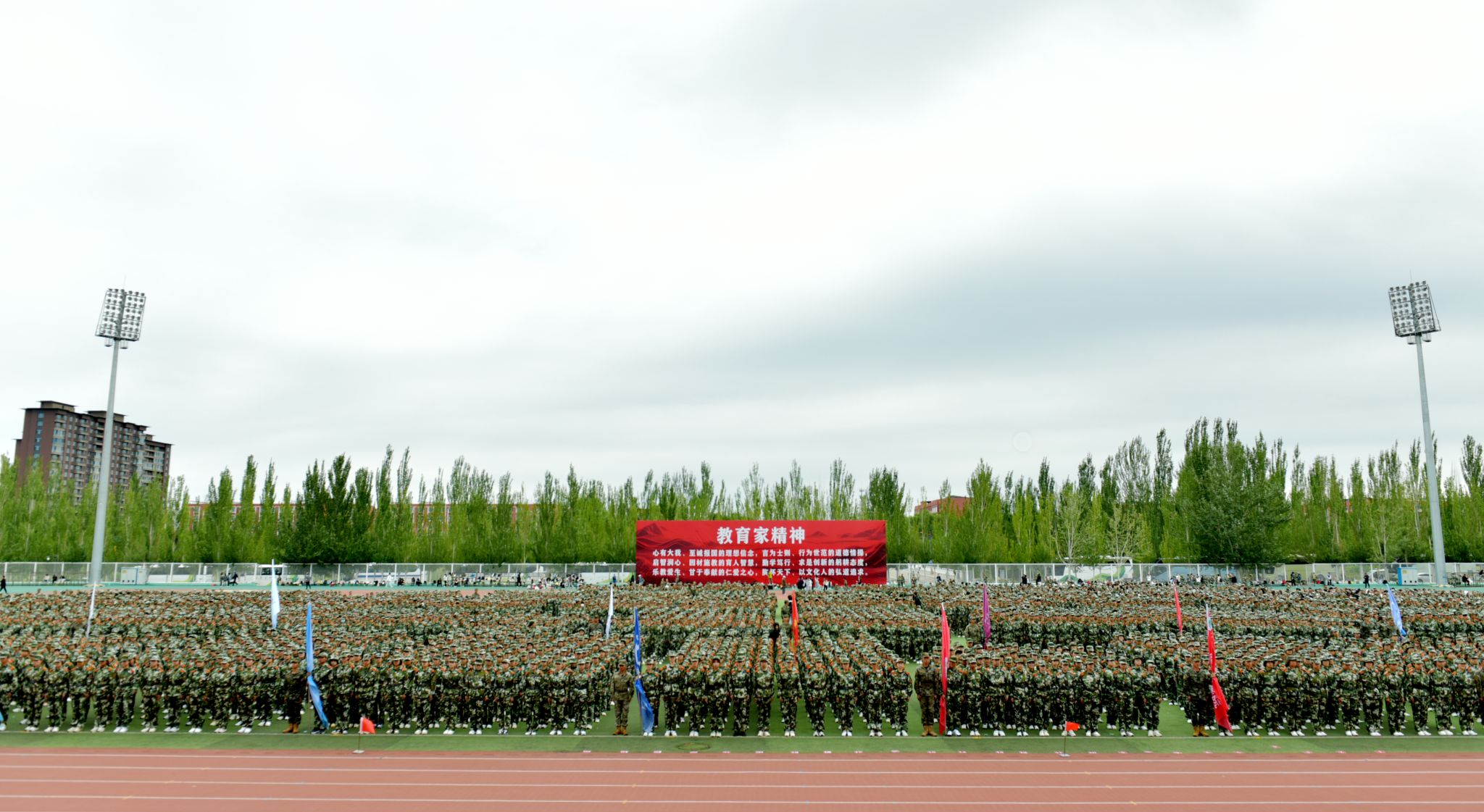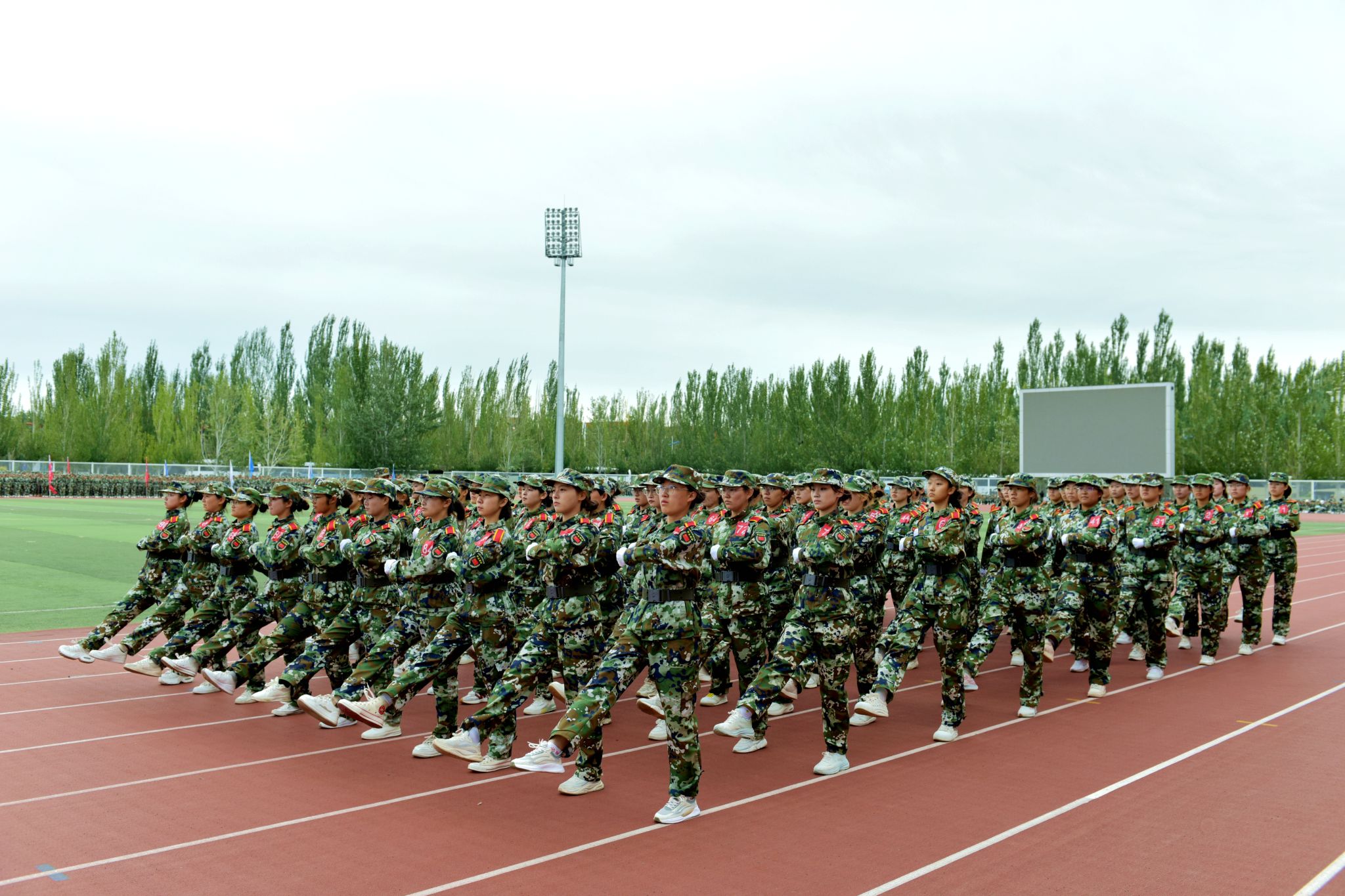 绿茵场上,军容严整;红旗招展,迎风猎猎。开学典礼在庄严的国歌声中拉开序幕,历经军训锤炼的新生更显坚毅。他们列队整齐,身姿挺拔,目光如炬,展现出青春的蓬勃力量与昂扬斗志。这一刻,汗水凝结为荣光,稚气蜕变为担当,崭新的大学篇章正以最铿锵的姿态书写开端。