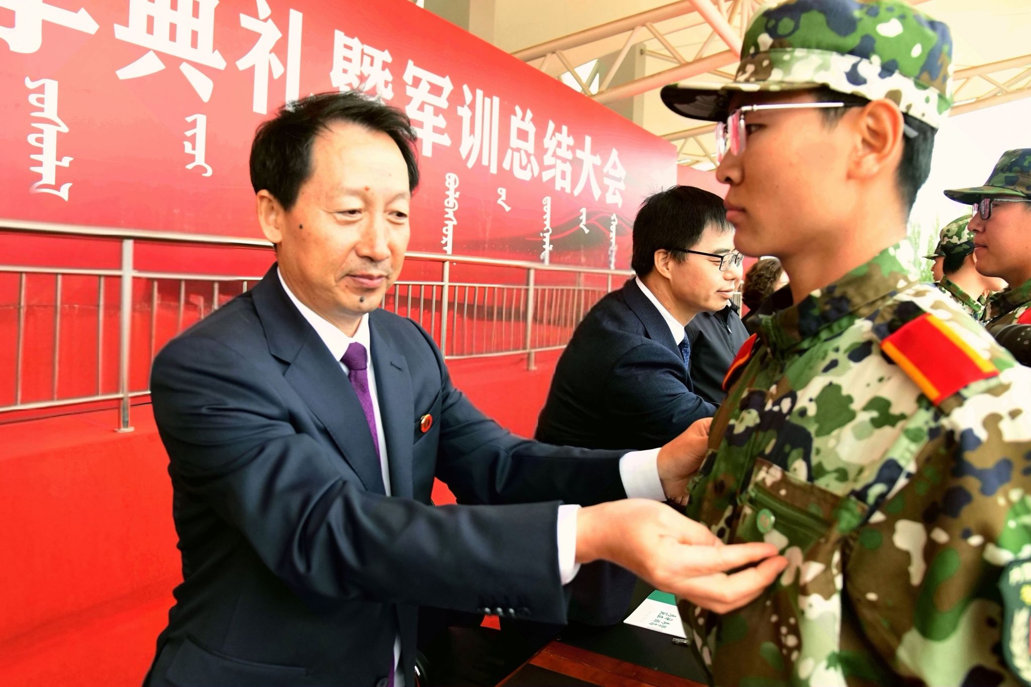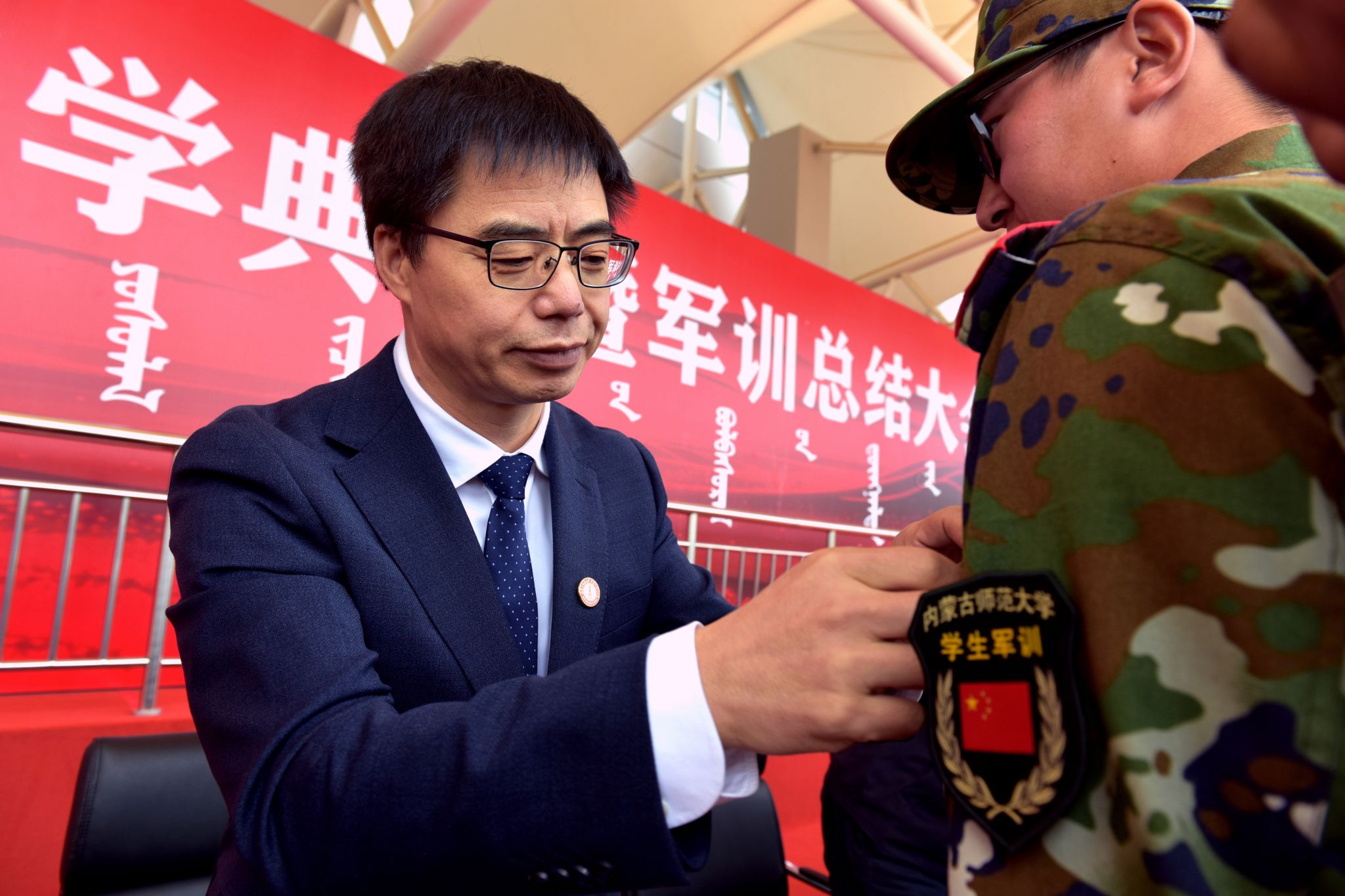 党委书记李树林为新生佩戴校徽