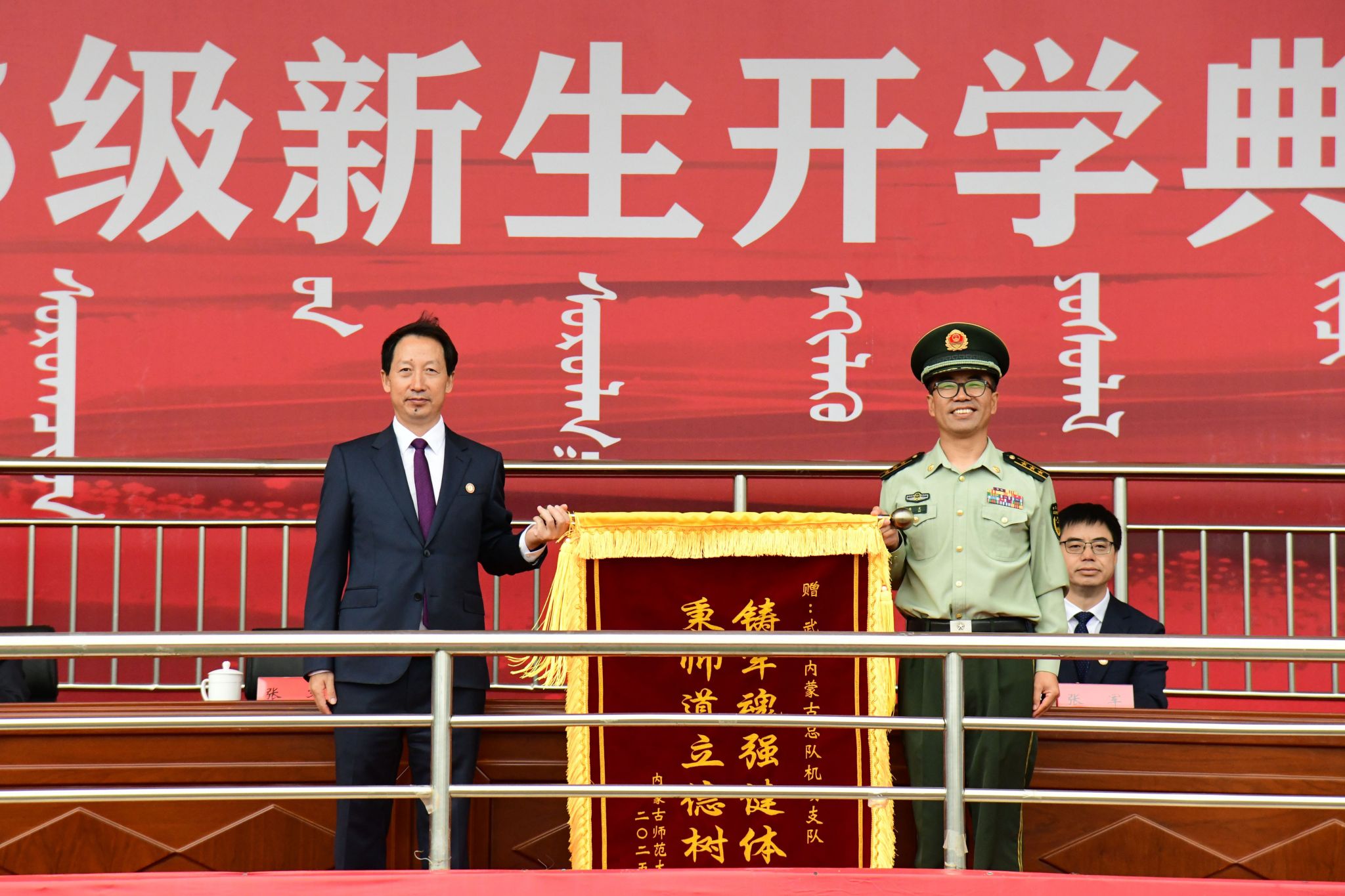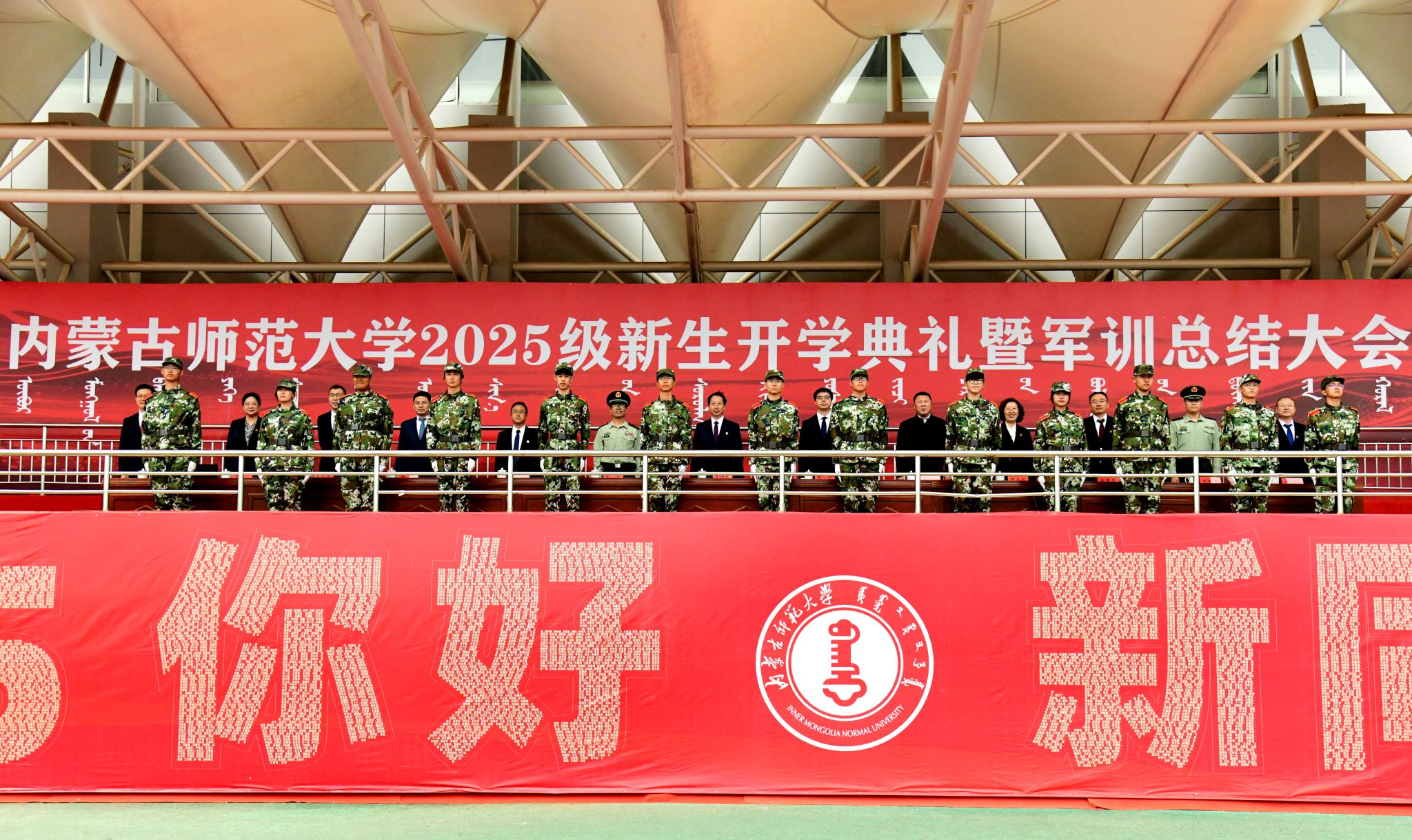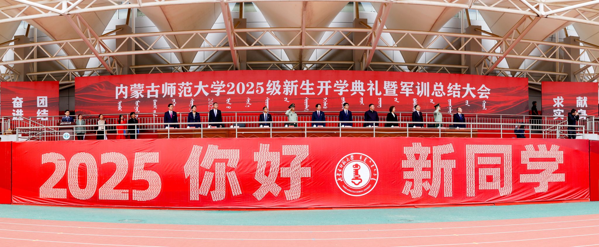 本网讯 9月16日,beat365中文官方网站2025级新生开学典礼暨军训总结大会在盛乐校区体育场举行。学校领导李树林、张军、斯钦、贾美林、韩巍、公茂果、景剑峰,和林格尔县委副书记、政法委书记阿古拉,武警某部政治委员张文、参谋武疆博出席典礼。新生军训承训部队全体教官,学校相关部门负责同志,各学院有关负责同志、辅导员、新生班主任以及2025级全体新同学参加典礼。开学典礼由韩巍主持。