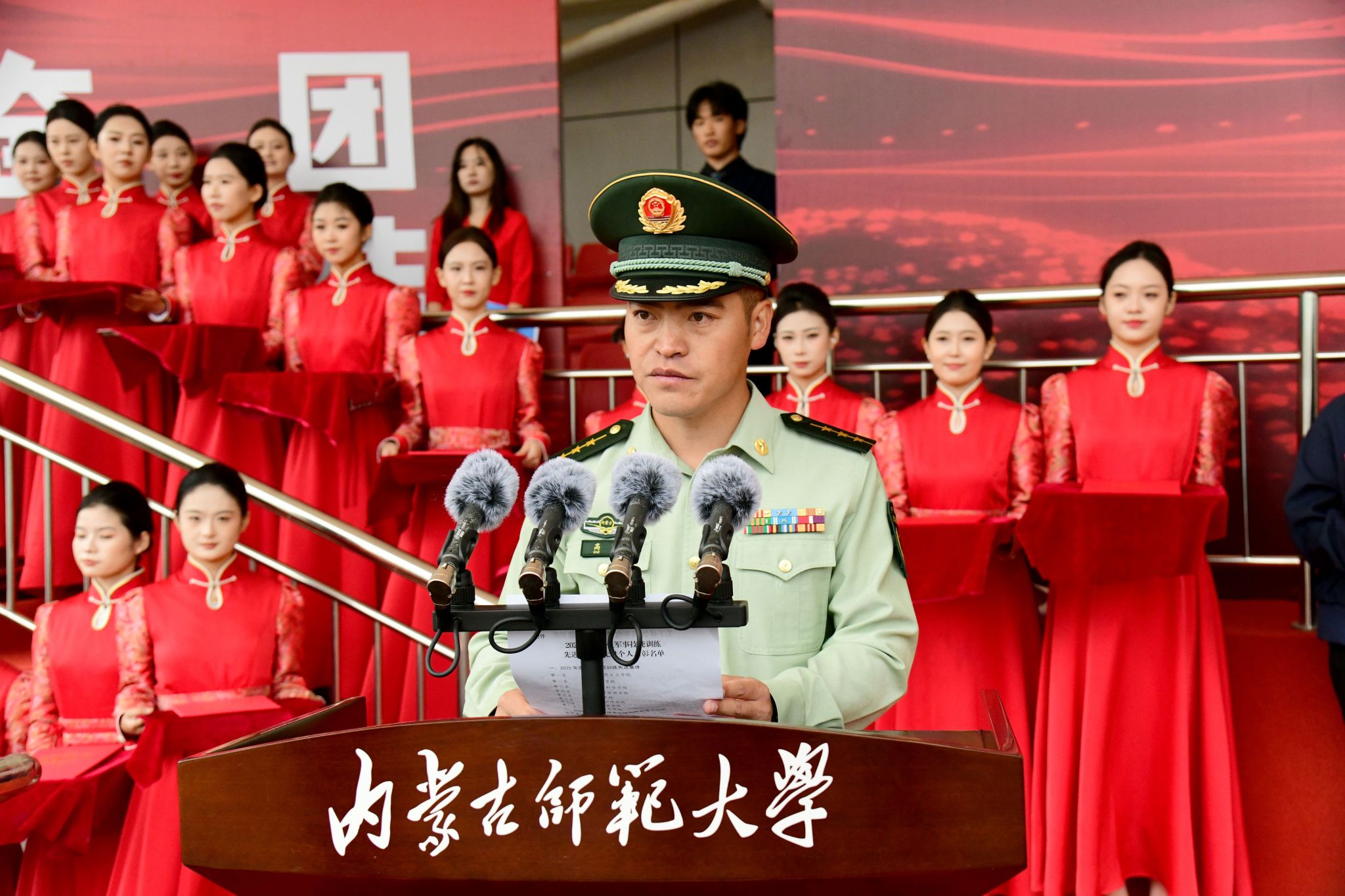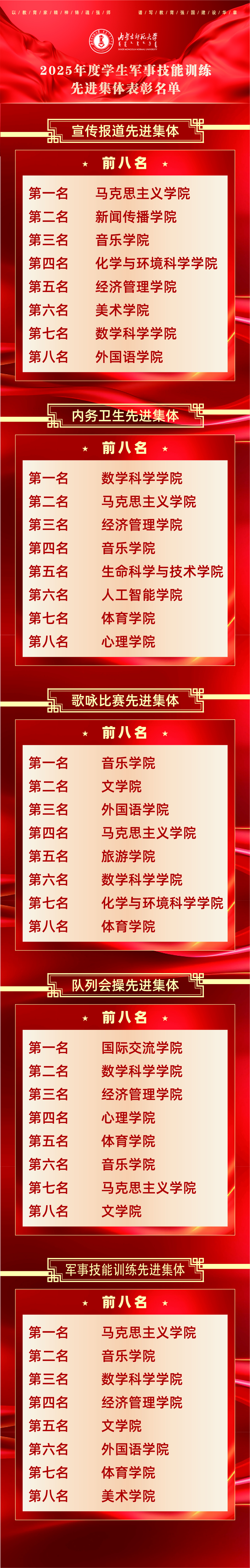 经评选,马克思主义学院等8个学院被评为军训师“宣传报道先进集体”、数学科学学院等8个学院被评为军训师“内务卫生先进集体”、音乐学院等8个学院被评为军训师“歌咏比赛先进集体”、国际交流学院等8个学院被评为军训师“队列会操先进集体”、马克思主义学院等8个学院被评为“2025年度学生军事技能训练先进集体”,斯琴满都呼等13人被评为“2025年度军事技能训练校级先进工作者”、郭雅清等554人被评为“2025年度学生军事技能训练标兵”。