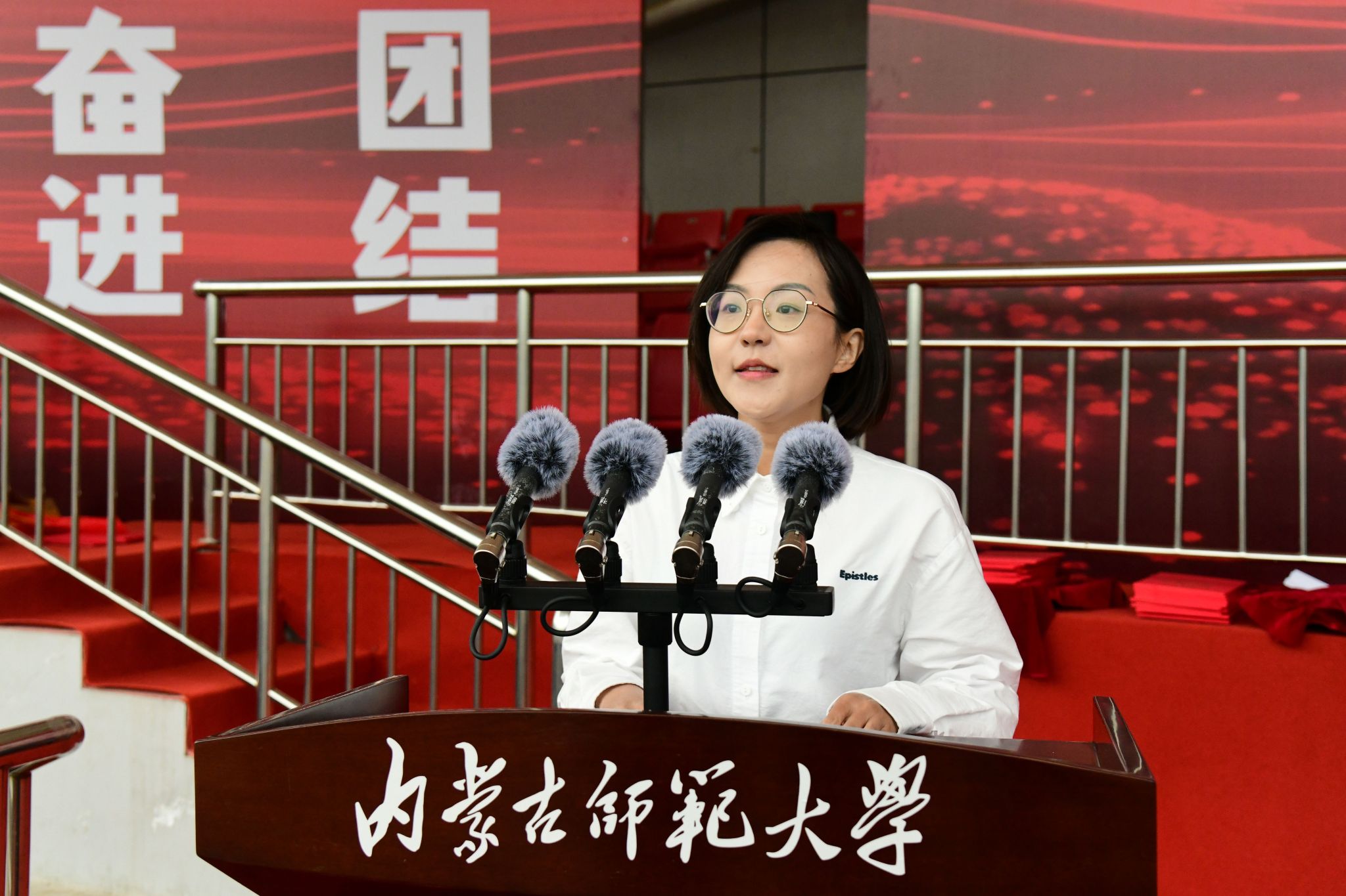 “献身、求实、团结、奋进”的校训激励人心,胸前佩戴的校徽熠熠生辉,作为师大人专属的独特标识,指引一代代师大人弘扬优良传统、树立远大理想,始终将自身发展同国家和自治区的前途命运紧密联系在一起,风雨无阻,高歌前行。
