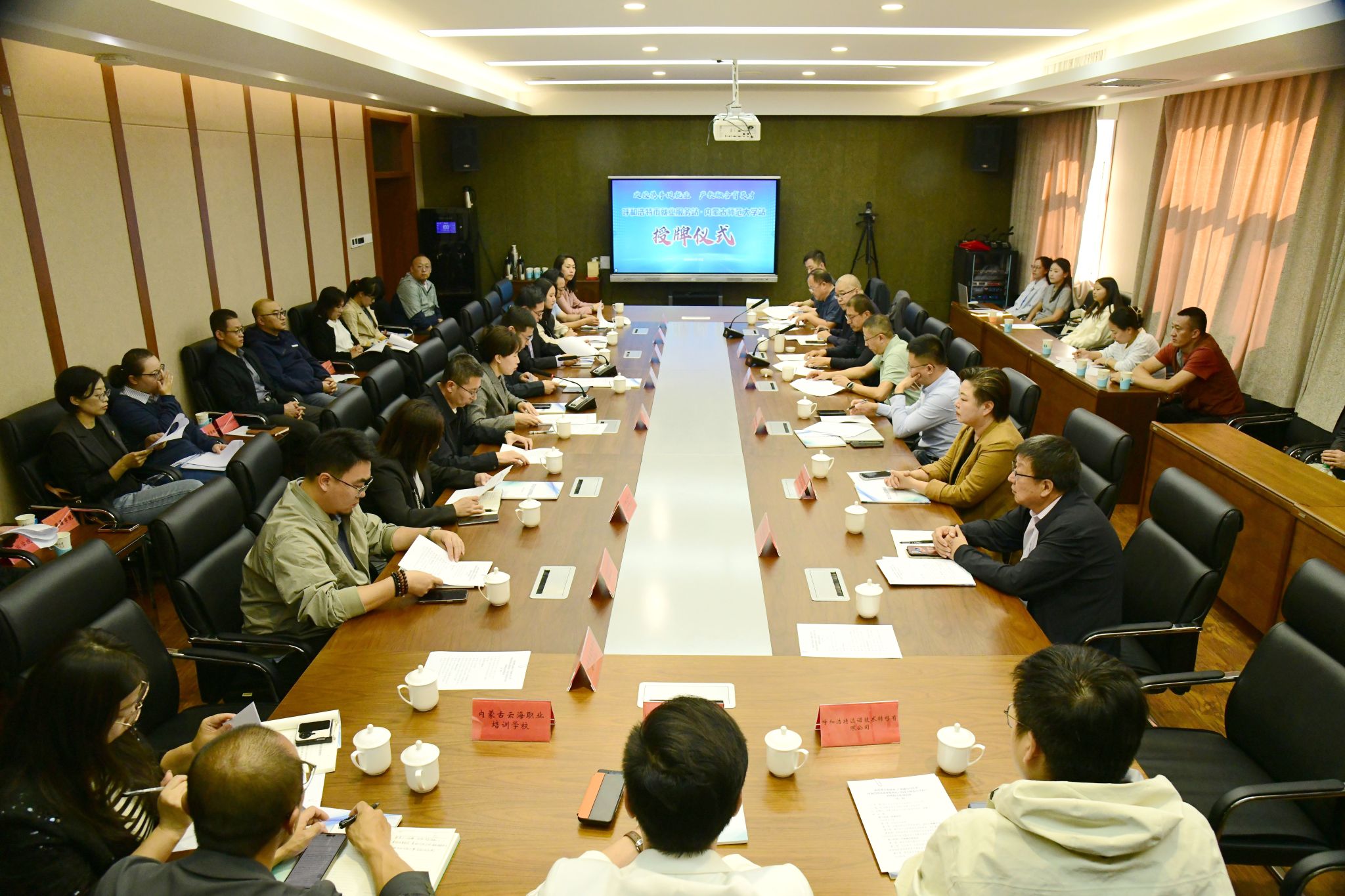 本网讯 为深入实施就业优先战略,落实就业促进行动,推动人才链与产业链深度融合,9月18日下午,“政校携手促就业 产教融合育英才”呼和浩特市就业服务站(beat365中文官方网站站)授牌仪式在文史楼2号会议室举行。校党委委员、副校长韩巍,呼和浩特市就业服务中心副主任莫日更,赛罕区人力资源和社会保障局局长张志强出席会议。