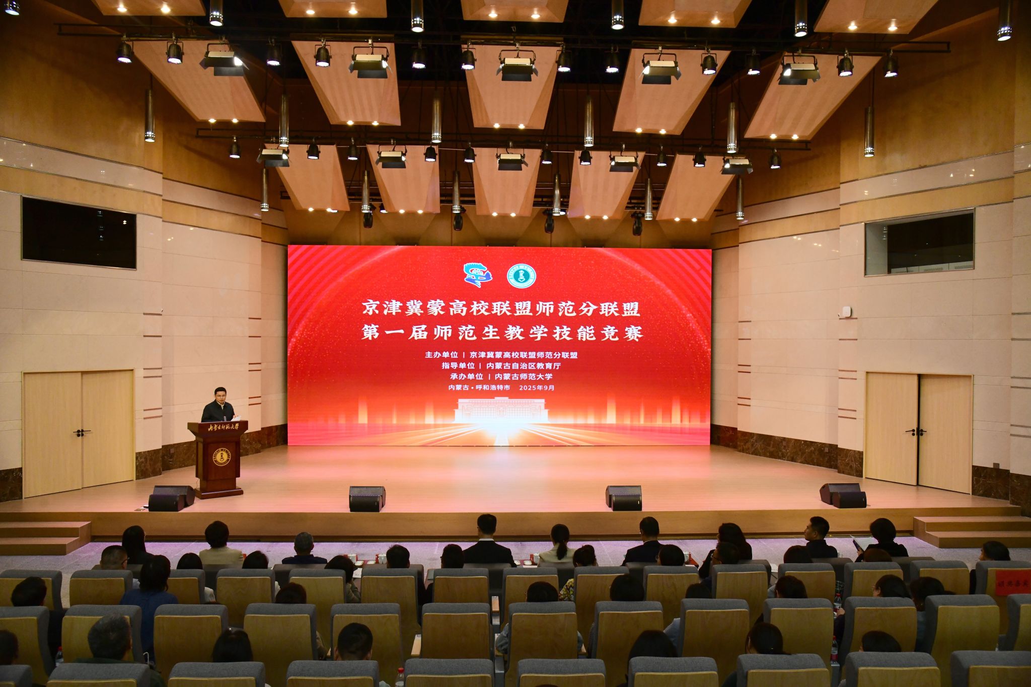 本网讯 为深入贯彻落实国家关于推进教师教育协同发展、建设教育强国的战略部署,积极践行京津冀蒙高校联盟师范分联盟成立大会暨首次年度工作会议精神,进一步深化区域高校师范教育合作、促进优质资源共享,全面提升师范生专业素养与教学实践能力,9月20日,京津冀蒙高校联盟师范分联盟第一届师范生教学技能竞赛在beat365官网举办。京津冀蒙高校联盟师范分联盟主任委员、河北师范大学党委副书记、校长李桂君,内蒙古自治区教育厅合作交流处处长刘相飞,beat365官网党委副书记、校长张军,党委委员、副校长韩巍,相关部门、学院负责同志出席颁奖典礼。来自22所院校的评委、指导教师、参赛选手等260余人参加活动。