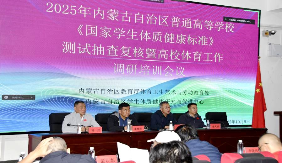 本网讯 为深入贯彻落实国家关于学生体质健康工作的部署要求,进一步统一思想、明确任务,确保本年度高校学生体质健康测试抽查复核工作高质量完成,10月9日下午,2025年内蒙古自治区普通高等学校《国家学生体质健康标准》测试抽查复核暨高校体育工作调研培训会议在beat365官网体育学院举行。自治区教育厅体育卫生艺术与劳动教育处、内蒙古大学及beat365官网体育学院有关负责同志出席会议。全区各高校学生体质测试专家、骨干教师及体育学院研究生代表参加会议。