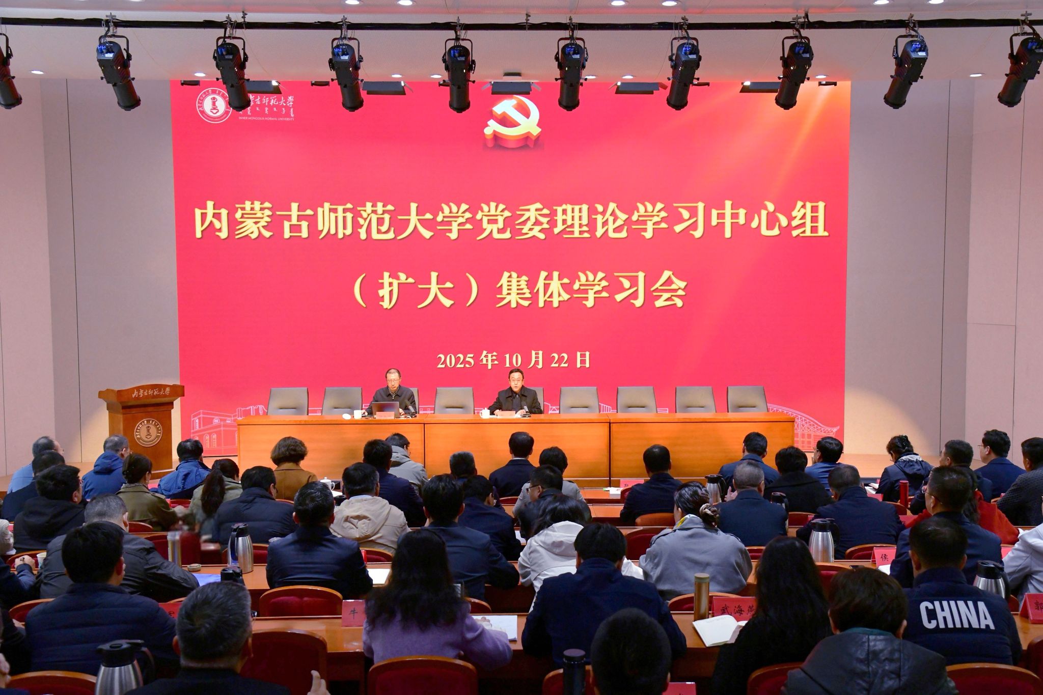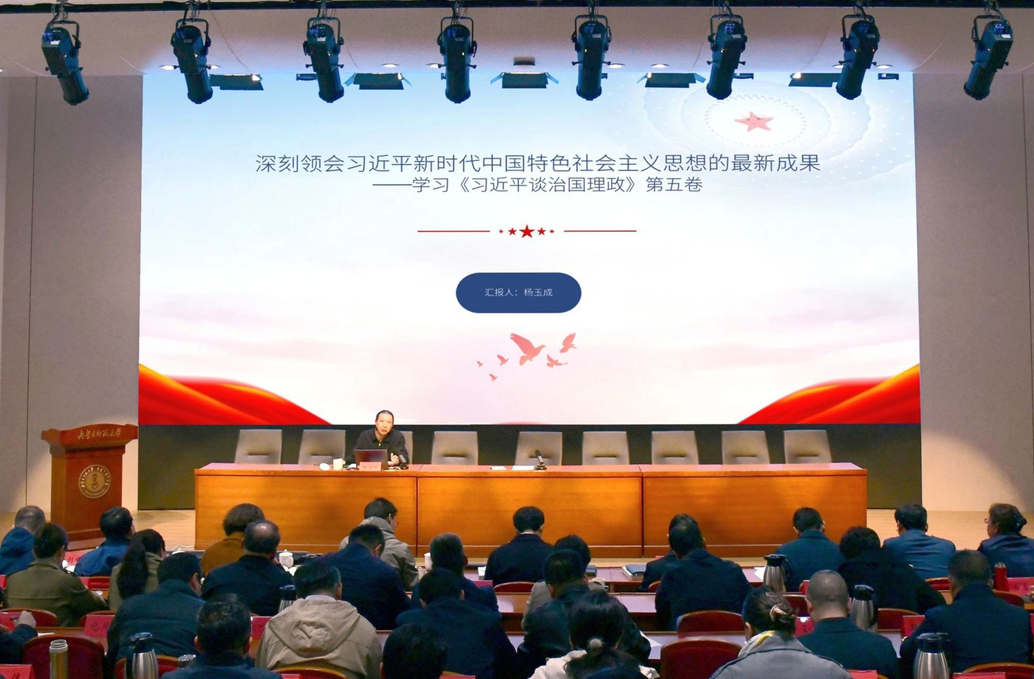 本网讯 10月22日下午,学校党委理论学习中心组(扩大)集体学习会在赛罕校区信息楼学术交流中心报告厅举行。中央党校哲学部教研室主任,beat365官网党委委员、副校长杨玉成以“习近平新时代中国特色社会主义思想最新成果——学习《习近平谈治国理政》第五卷”为题作专题辅导。校党委理论学习中心组成员、全校副处级以上干部参加学习会。党委副书记斯钦主持学习会。