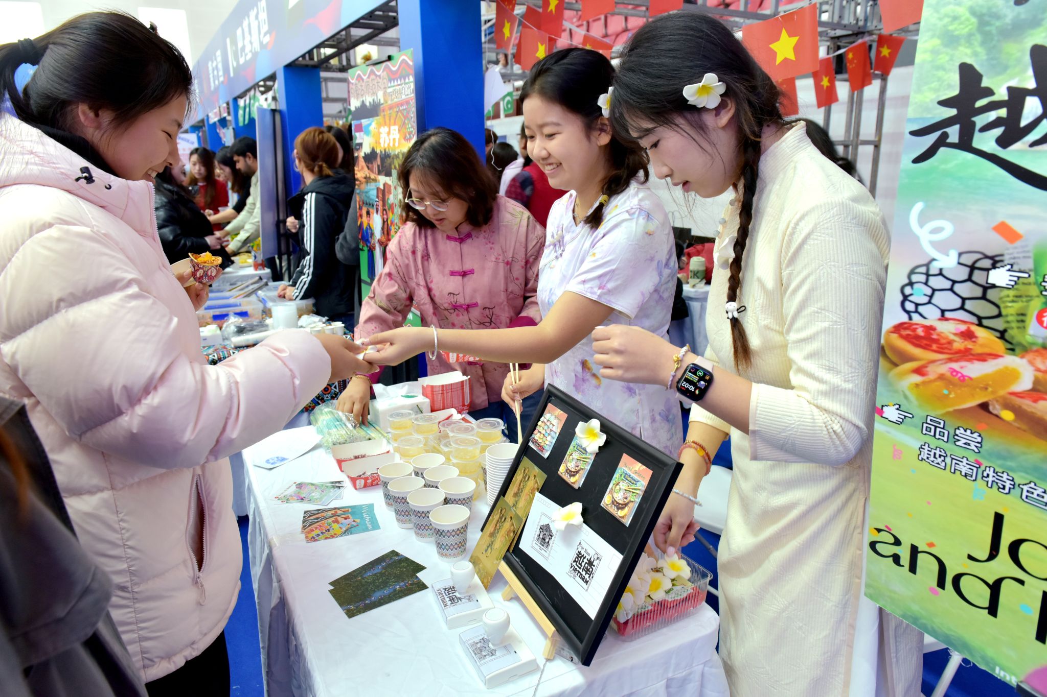 活动现场,各国文化展区异彩纷呈。来自不同国家的学生通过特色工艺品、传统服饰、图片资料及地道美食,展示各自文化的独特魅力。巴基斯坦香米饭、哈萨克斯坦马肠、老挝青木瓜沙拉等美食备受青睐;中国剪纸、书法体验、香包制作、民族服饰试穿等传统文化也吸引众多师生参与。大家在亲身体验中增进理解,在交流互动中深化友谊。