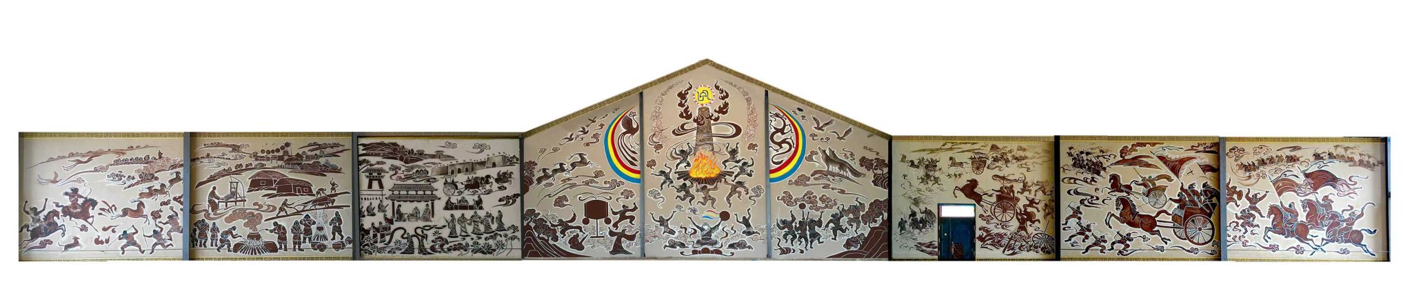 作品名称:印象义渠舞台壁画 作者:侯也团队 尺寸:中间高7.5米,两边高4.2米,长42米 材质:真石漆、丙烯