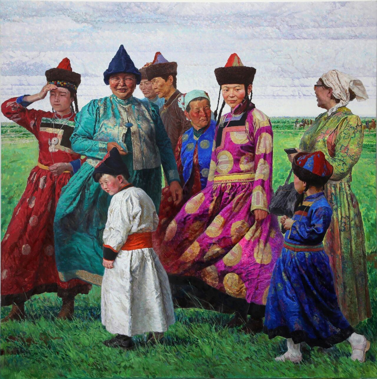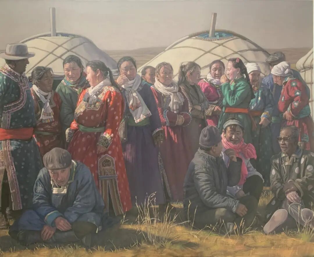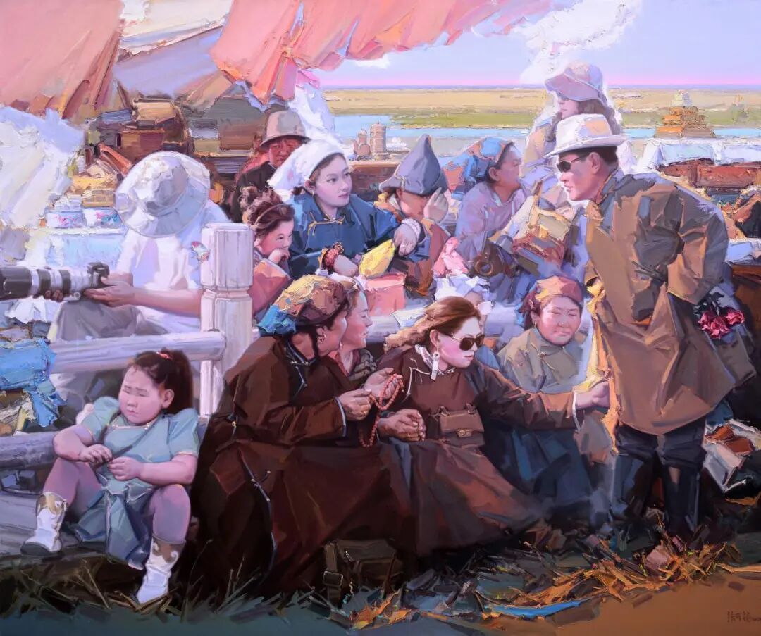 作品名称:家庭那达慕上的人们 作者:李喜成 尺寸:184×224cm 材质:油画