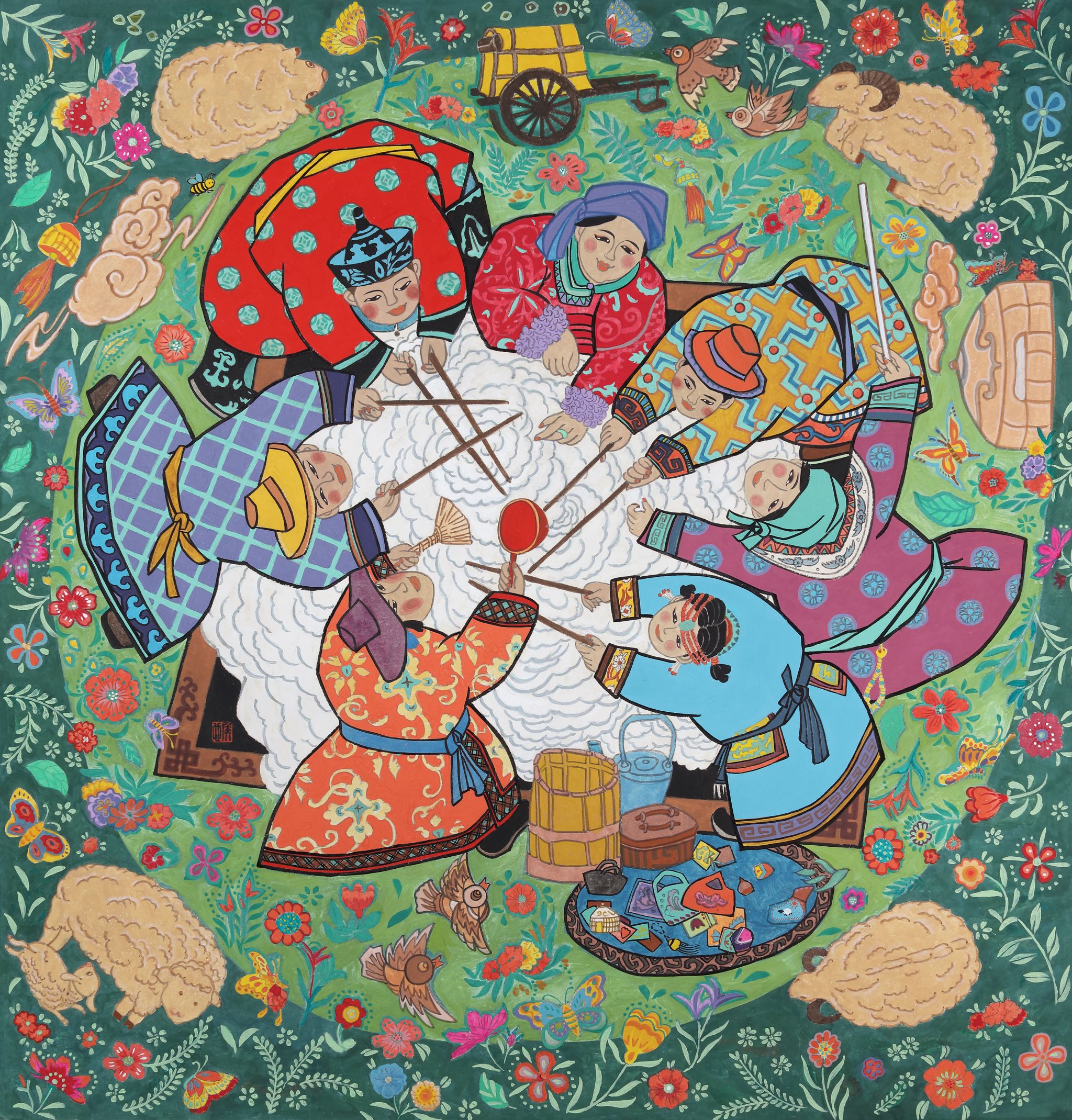 作品名称:祥毡织梦 作者:侯也 尺寸:105×100cm 材质:纸本重彩(注:作品被中华艺术宫收藏)