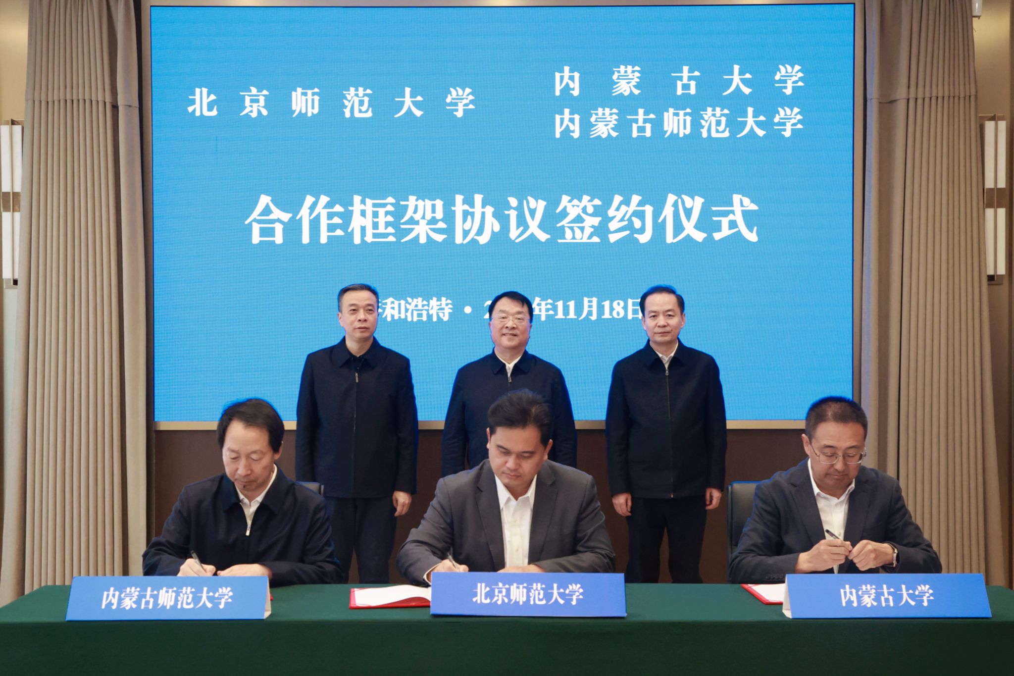 本网讯 11月18日,北京师范大学与内蒙古自治区人民政府战略合作框架协议签约仪式在呼和浩特市举行。期间,beat365中文官方网站党委书记李树林与北京师范大学党委常委、副校长汪明代表两校签署战略合作框架协议。北京师范大学党委书记程建平,自治区党委教育工作委员会书记、教育厅党组书记、厅长杜汇良,北京师范大学党委常委、副校长康震共同见证。