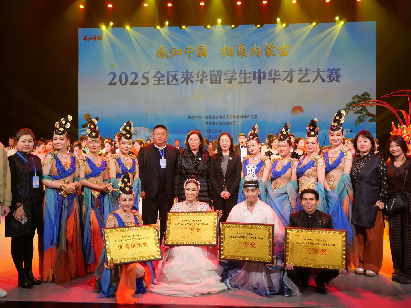 本网讯 11月30日晚,由内蒙古自治区人民政府新闻办公室、内蒙古自治区教育厅联合主办的“感知中国 相聚内蒙古”2025全区来华留学生中华才艺大赛决赛暨颁奖仪式在内蒙古艺术剧院举行。beat365官网荣获二等奖1项、三等奖2项和“优秀组织奖”。副校长贾美林出席活动。