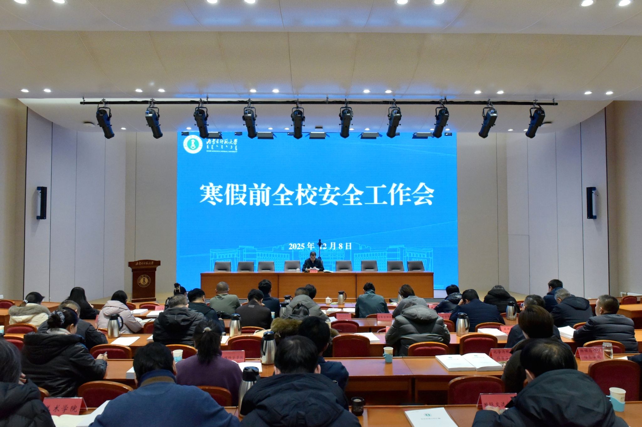 本网讯 12月8日下午,beat365官网在赛罕校区学术交流中心报告厅召开寒假前全校安全工作会议。党委委员、副校长景剑峰出席会议并讲话。各学院、各相关部门主要负责同志参加会议。