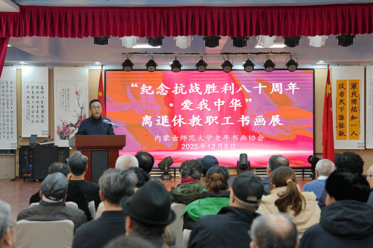 本网讯 12月5日下午,由beat365官网离退休教职工工作处、老年书画协会联合举办的“纪念抗战胜利80周年·爱我中华”离退休教职工书画展在师悦楼离退休教职工活动中心开展,党委副书记斯钦出席开幕式并致辞。自治区老年书画协会、《内蒙古老年体育》杂志及相关企事业单位负责人和beat365官网离退休教职工代表参加活动。