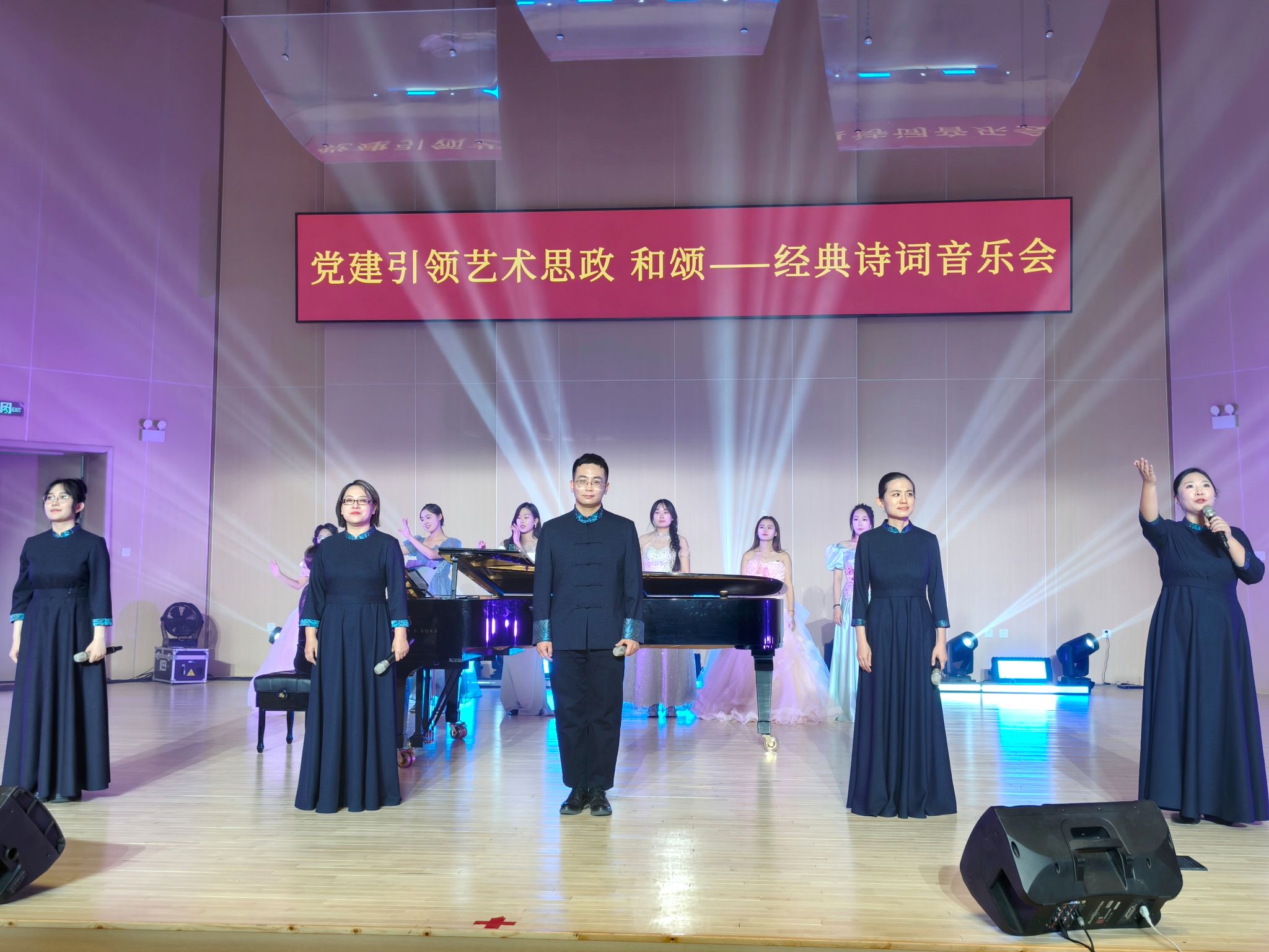 本场音乐会由音乐学院、文学院师生及教师合唱团联袂呈现,将文学经典、艺术表现与价值引领有机融合,通过声乐、器乐、舞蹈、朗诵、书法等多元形式,演绎了《关雎》《将进酒》《琵琶行》《如梦令》《定风波·莫听穿林打叶声》《青玉案·元夕》《忆秦娥·娄山关》等16部经典诗词作品,在美的熏陶中实现了思想启迪与精神塑造的育人效果。