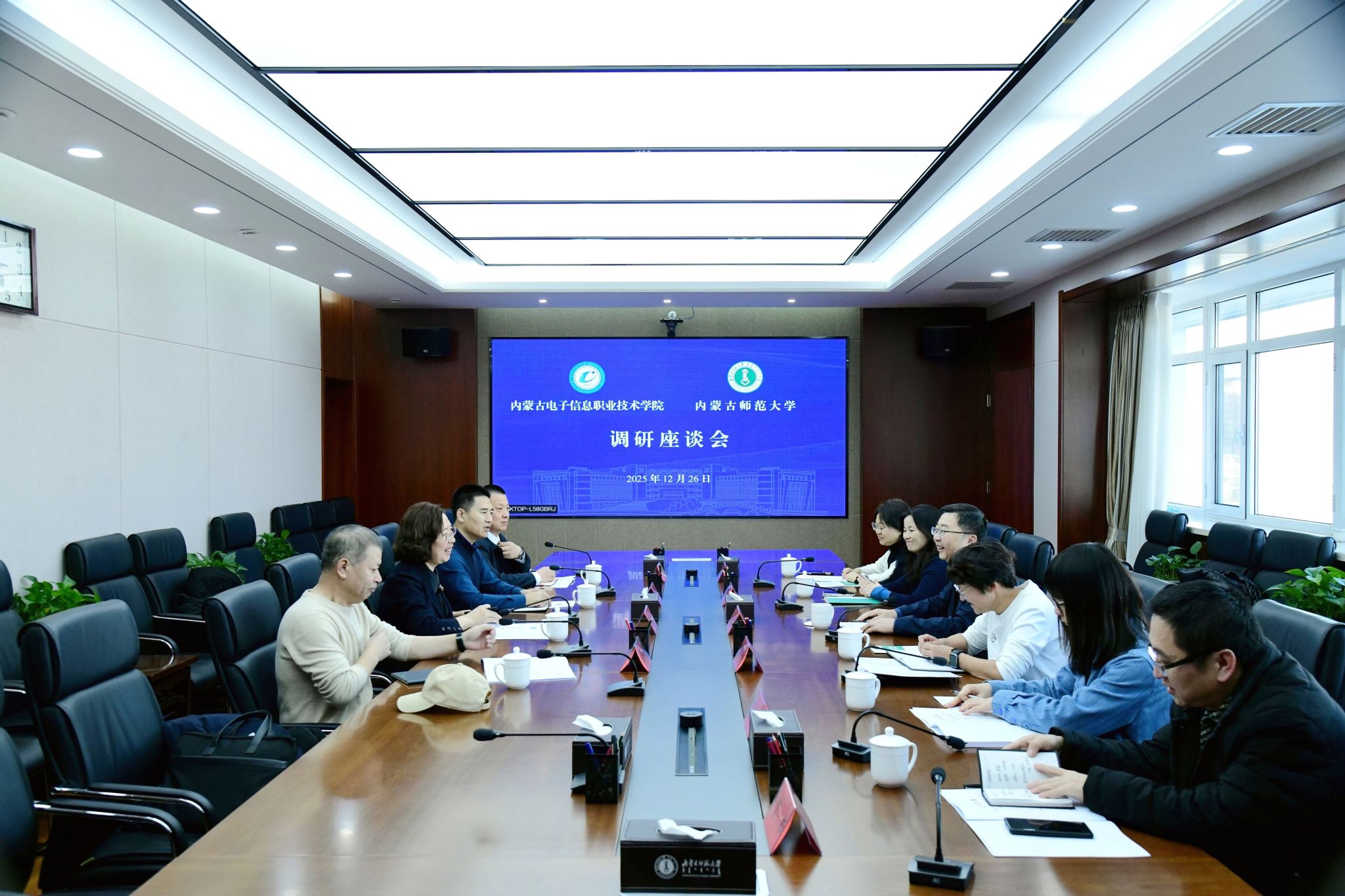 本网讯 12月26日下午,内蒙古电子信息职业技术学院党委副书记、校长林民,党委委员、副校长秦婷一行来beat365官网调研,与beat365官网副校长贾美林及相关单位负责同志进行座谈交流。
