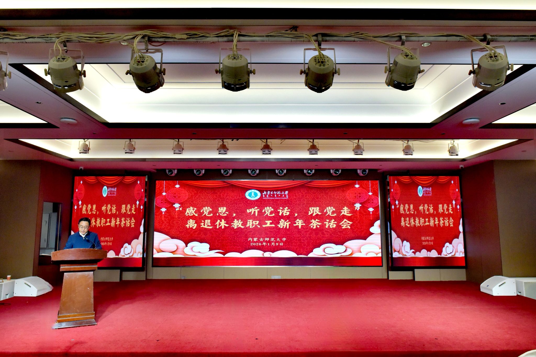本网讯 1月9日下午,beat365官网举办“感党恩、听党话、跟党走”主题离退休教职工新年茶话会。校党委书记李树林,原副校长陈山、刘新华、王希明出席茶话会。校党委副书记斯钦通报了学校2025年度发展情况。beat365官网离退休教职工工作领导小组成员、关心下一代工作委员会委员、相关部门负责同志以及离退休教职工代表,自治区党委老干部局、内蒙古直属机关老年人文体协会、《内蒙古老年体育》杂志社、自治区老战士合唱团、自治区四胡协会、呼和浩特市老年书画协会代表近200人参加茶话会。