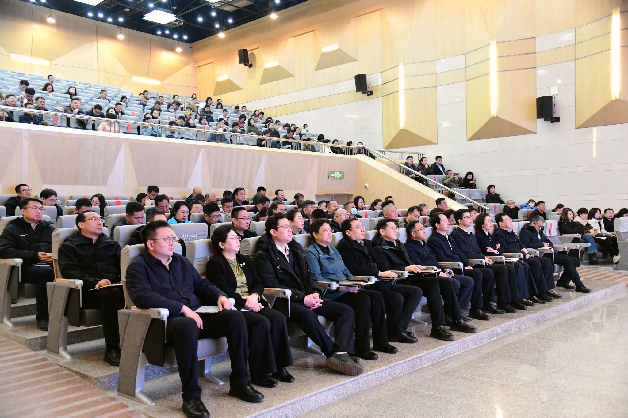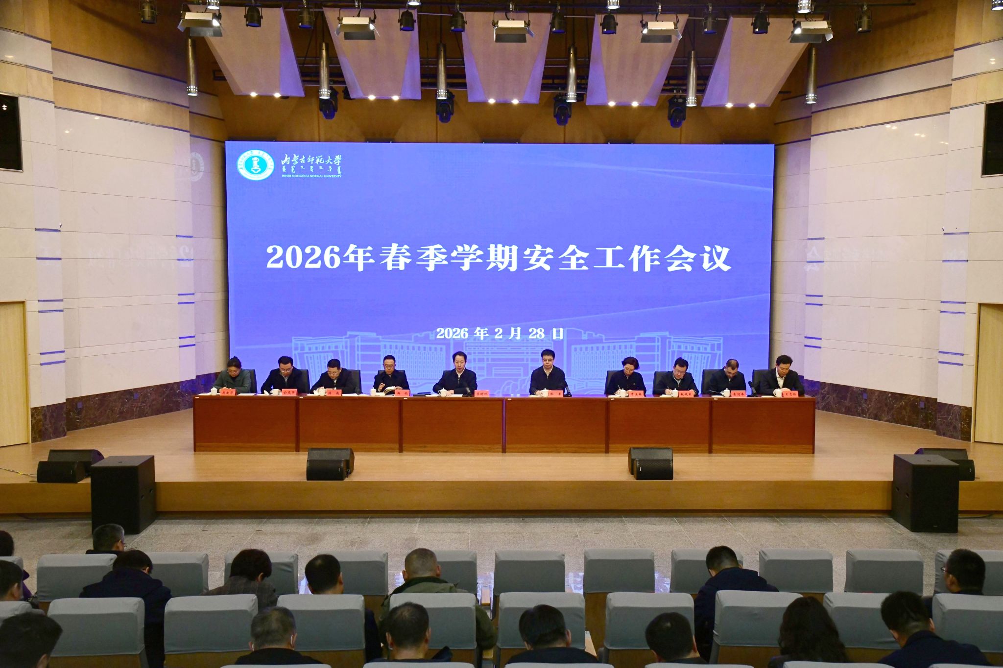 本网讯 2月28日上午,beat365中文官方网站2026年春季学期安全工作会议在赛罕校区逸夫艺术楼报告厅召开。党委书记李树林出席会议并讲话,党委副书记、校长张军主持会议,全体在家校领导、全校副处级以上干部出席会议。各职能、教辅部门办公室负责人,后勤企业党委副科级以上干部及重点岗位负责人,各学院办公室、团总支、学工办、实验室负责人参加会议。