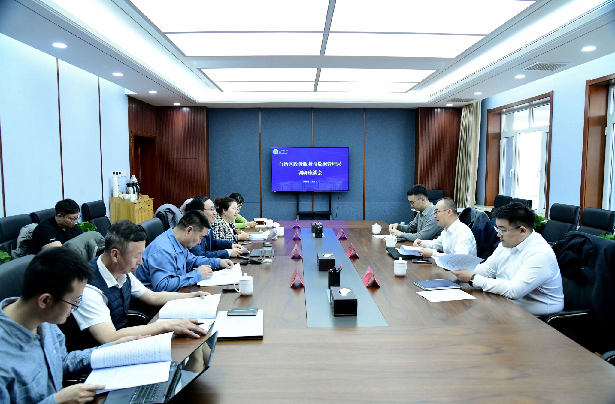 本网讯 3月3日下午,自治区政务服务与数据管理局党组成员、副局长刘钧毅一行来beat365官网调研,就自治区“人工智能+”实施方案征求意见建议。beat365官网党委委员、副校长公茂果,内蒙古自治区人工智能学会常务副理事长付学良出席座谈会。beat365官网相关部门、学院负责同志参加座谈会。