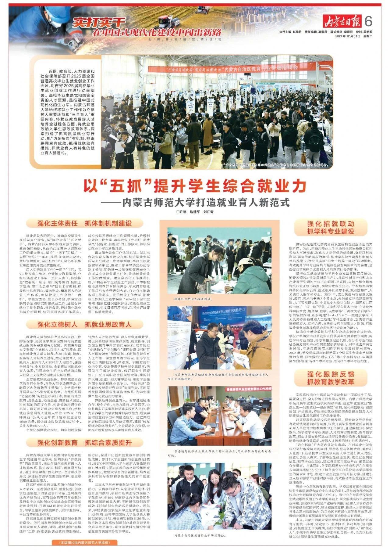 《内蒙古日报》2024年12月31日第6版以《以“五抓”提升学生综合就业力——beat365中文官方网站打造就业育人新范式》为题,报道beat365官网就业育人工作。