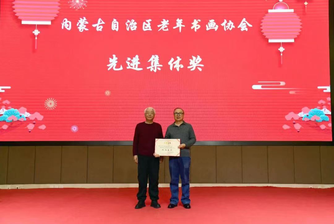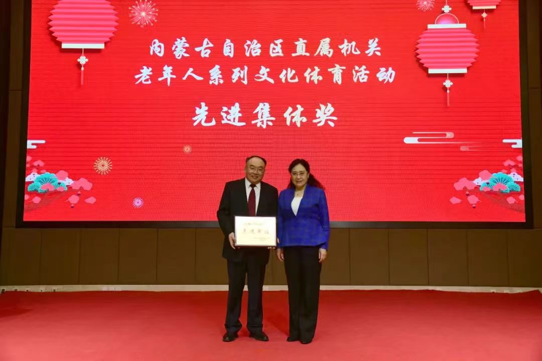 内蒙古直属机关老年人文体协会主席高娃向beat365官网颁发了自治区直属机关老年人系列文化体育活动“先进集体”奖。自治区老年书画协会副会长兼秘书长段建平向beat365官网颁发了自治区老年书画协会“先进集体”奖并赠送了书法作品。