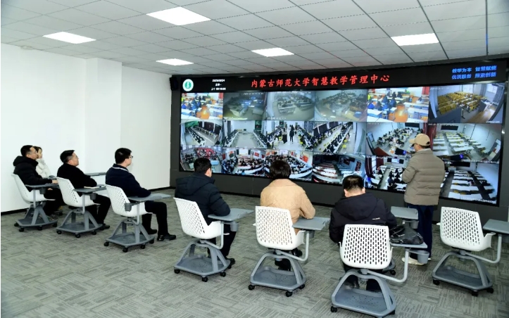 随后,张军一行来到学校“智慧教学管理中心”,现场观摩并详细了解了智慧教学管理系统的建设成果。该中心是学校“人工智能+教学管理”的新举措,2024年建设落成,“内师在线”系统现已集成前沿人工智能技术,实现了教学资源的智能分配、教学活动的精确管理以及教学数据的深入分析。系统已覆盖218间教室,提供实时全程教学监控功能,为评课互动及构建教学质量监控闭环体系奠定了坚实基础。