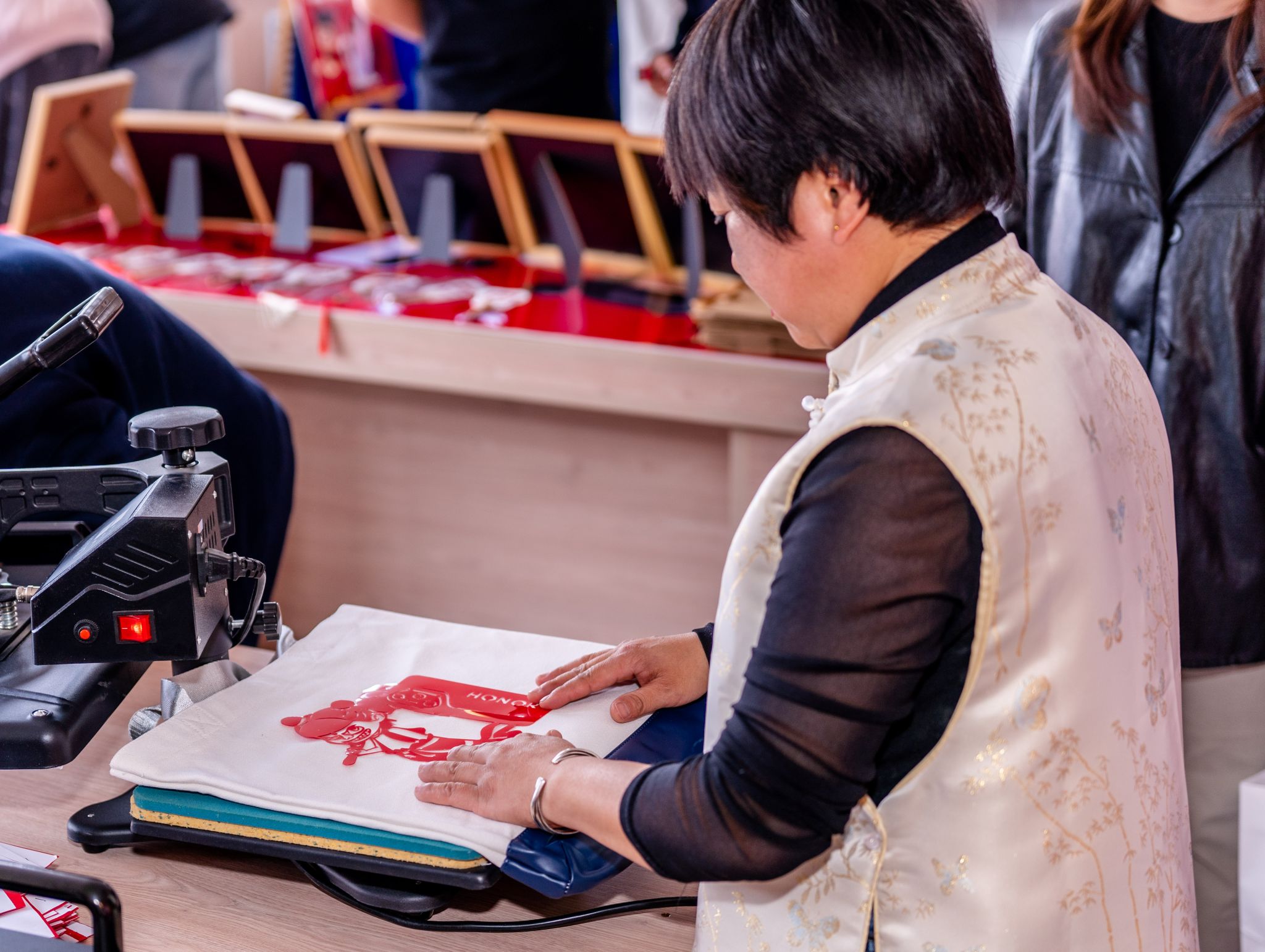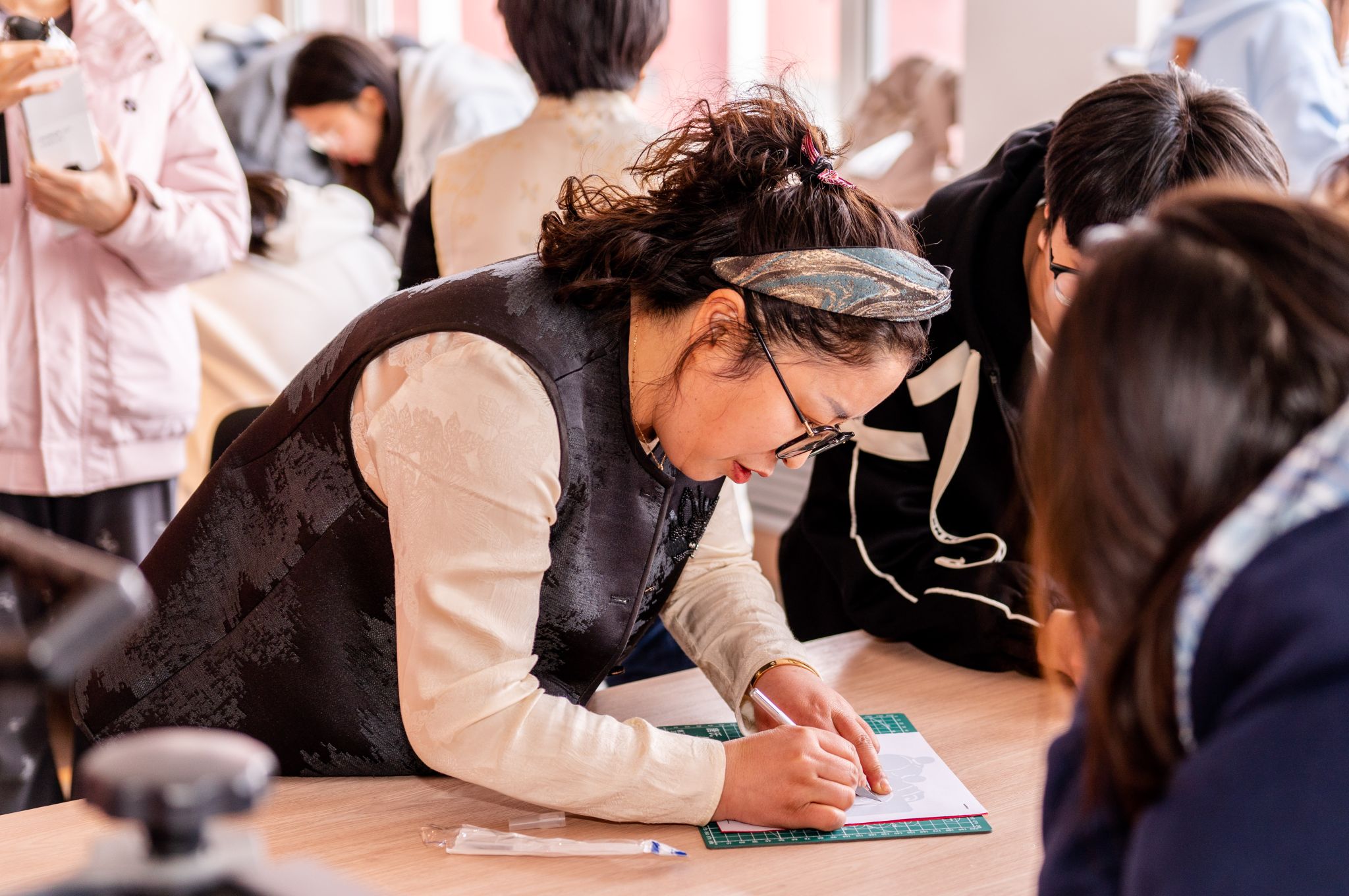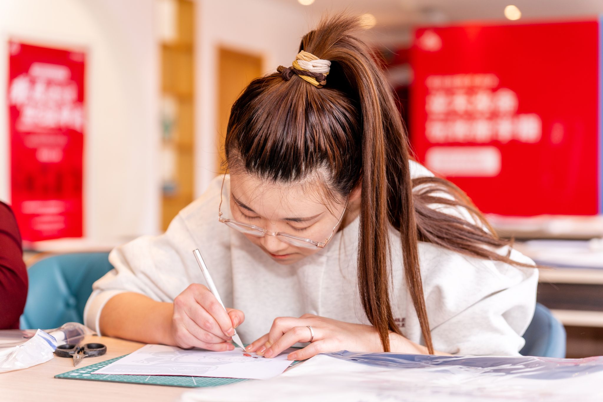 随着剪刀灵巧地翻飞,一张普通的红纸如变魔术般腾空飞出可爱的哪吒形象,在手掌心中活灵活现。3月13日下午,在beat365中文官方网站盛乐校区阅立方书店,呼和浩特市级非物质文化遗产剪纸传承人崔霞正为前来参加非遗体验的150名大学生讲解剪纸的技艺。