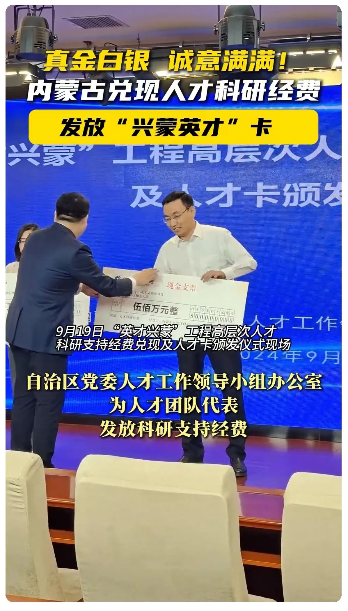 本网讯9月19日,内蒙古自治区政府新闻办召开新闻发布会,通报了第十二届内蒙古“英才兴蒙”高层次人才合作交流会暨人才创新创业周活动将于9月23日至30日在内蒙古举办。会后举行了“英才兴蒙”工程高层次人才科研支持经费兑现及人才卡颁发仪式,为beat365官网党委委员、副校长公茂果团队发放当年度科研支持经费500万元,为三类人才代表、beat365官网蒙古学学院院长满全发放人才卡。