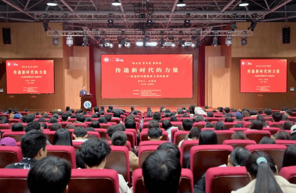 林超俊围绕“读文秀 听文秀 看文秀——文秀是一个怎样的时代新人?”“学文秀 定目标 当优秀——文秀有着怎样的成长轨迹?”“学文秀 勇担当 知感恩—文秀是如何为人处世的?”“学文秀 传文化 正家风——文秀是怎样传承民族文化的?有怎样的家风?”“学文秀 强本领 有涵养--文秀是怎样去工作的?”“懂感恩 敢担当 有作为--文秀给我们怎样的人生启迪?”六个主题讲故事、谈创作、聊好书,带领大家重温文秀成长的温情故事,讲述了黄文秀努力拼搏、奋发向上,投身脱贫攻坚伟业,谱写新时代青春之歌的先进事迹,为大家展现了一个对父母对亲人孝顺热情、对工作对事业充满激情、对家乡对人民饱含真情的壮家优秀儿女的形象。在场师生都被黄文秀事迹所蕴含的青春力量和奋斗精神所感染,深受感动。