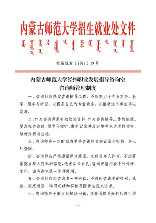 咨询室实行规范化管理,先后建立了《beat365中文官方网站经纬职业发展指导咨询室咨询师管理制度》《beat365中文官方网站经纬职业发展指导咨询室咨询流程》《beat365中文官方网站经纬职业发展指导咨询室集体教研制度》《beat365中文官方网站经纬职业发展指导咨询室服务规范》制度。并于2021年起,协同学院开展院级学生职业发展指导规划,目前完成了2.0版制度建设,为校院两级职涯教育的同步推进提供了制度保障。