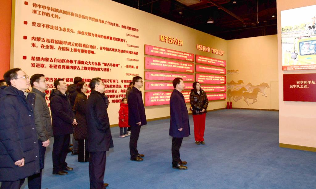 本网讯 2月24日下午,校党委理论学习中心组(扩大)学习会在内蒙古展览馆举行。校党委理论学习中心组全体成员,机关党委委员、部门负责同志、支部书记集体参观“牢记嘱托 感恩奋进——办好两件大事 奋力书写中国式现代化内蒙古新篇章”主题展。