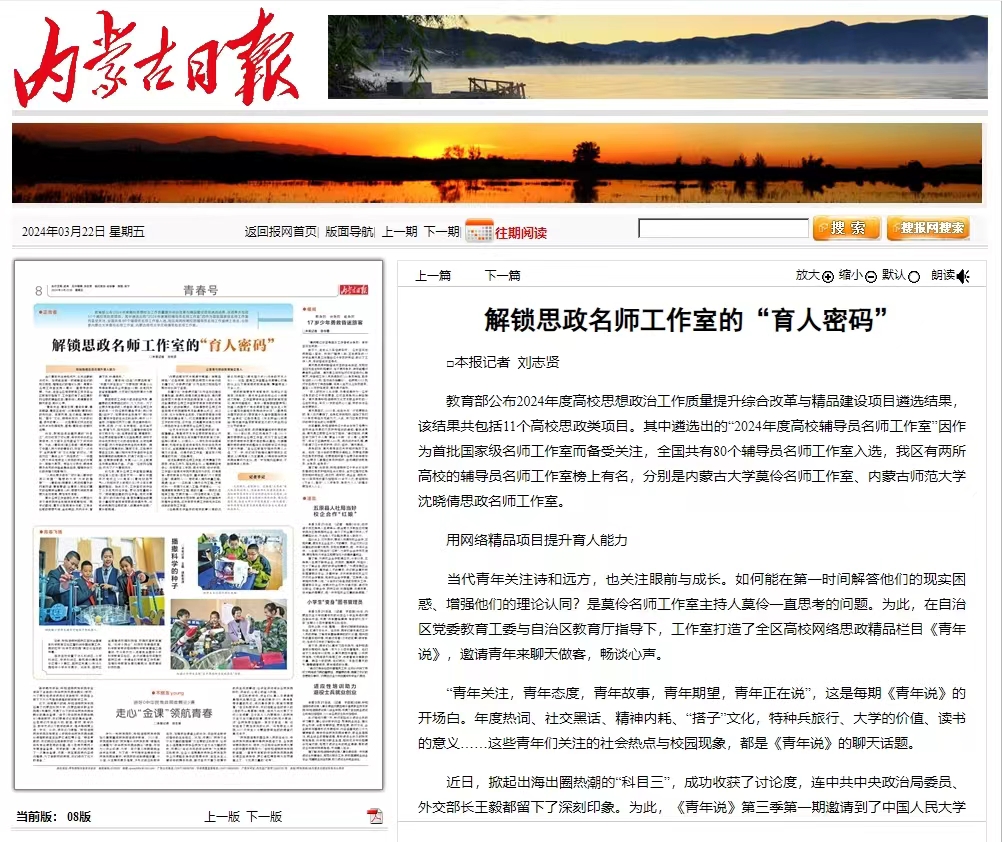 用网络精品项目提升育人能力 当代青年关注诗和远方,也关注眼前与成长。如何能在第一时间解答他们的现实困惑、增强他们的理论认同?是莫伶名师工作室主持人莫伶一直思考的问题。为此,在自治区党委教育工委与自治区教育厅指导下,工作室打造了全区高校网络思政精品栏目《青年说》,邀请青年来聊天做客,畅谈心声。 “青年关注,青年态度,青年故事,青年期望,青年正在说”,这是每期《青年说》的开场白。年度热词、社交黑话、精神内耗、“搭子”文化,特种兵旅行、大学的价值、读书的意义……这些青年们关注的社会热点与校园现象,都是《青年说》的聊天话题。 近日,掀起出海出圈热潮的“科目三”,成功收获了讨论度,连中共中央政治局委员、外交部长王毅都留下了深刻印象。为此,《青年说》第三季第一期邀请到了中国人民大学的青年们,开启了一次关于“全民造梗”与“文化传播”的讨论。“耳虫效应”“集体上分”“共性表达”……中国人民大学马克思主义学院的学生们与莫伶一起脑力激荡。师生纷纷表示,期待有更多优秀的作品能集体出海,增强中华文化的传播力和影响力。 “人帅也要多读书”“时代新人眼中的何以中国”“理想的大学 大学的理想”……《青年说》用青年人熟悉和喜欢的网言网语、青言青语,让青年人把他们喜欢的话题讲给青年人听,思想引领就变得更为生动有趣、更加有形有感。 莫伶名师工作室团队成员、内蒙古大学交通学院学生赵赫深有感触地说:“同学们都说,喜欢这样既有参与感、又有体验感的思想引领,金句频出,热热乎乎,看得下去、听得进去。” 目前,《青年说》已在“内蒙古教育”“中国大学生在线”“交想悦团”微信公众号等新媒体平台共推出18期,总有网友在留言里催更,大家亲切地称呼莫伶为思政“嘴替”。 要把思政工作做大做深做出气象,最重要的还是要回应时代,久久为功。为了让更多有信仰的人讲信仰,莫伶名师工作室的另一个网络思政精品项目《何以中国》出炉了:她带领学生投身于“何以中国”青年作答的社会实践当中,寻访19个省市,行程超过两万公里,足迹遍布四川、甘肃、陕西、广州、北京等地。在平遥瓦当、敦煌飞天、阳关古城、三星堆中窥见中华文明多元一体;在麦新故居、黄埔军校、乌梁素海感悟华夏儿女血脉赓续,惊叹于中华优秀传统文化的浩如烟海,也被她兼收并蓄、历久弥新的勃勃生机所激励。同学们经过搜集资料、撰写文本、实地寻访等自主实践,辅以相关专家学者的专业视角和精美的后期制作,打造了包括MG动画、主题原创歌曲、专属logo、线上配套活动等全媒体产品。产品一经在网络播出,吸引了广大青年网友。 近几年,莫伶名师工作室推出精品网络育人栏目《百年家书——献礼中国共产党成立100周年》《青说廿四节气》。《我和我家乡的现代化》于今年也要重磅推出。除此之外,工作室还创作出了众多优秀网络作品,累计浏览量破千万。“用破壁出圈的网络作品,完成与青年、时代的双向对话,彰显挺膺担当的青年力量和可信可爱可敬的中国形象,这或许就是网络思政育人的真谛所在吧!”莫伶感慨道。 让美育与思政教育融合育人 “内蒙古剪纸艺术起源于哪里?有哪些特色?”这些问题,在beat365中文官方网站举行的北疆文化“与非遗对画”系列活动之和林格尔剪纸中找到了答案。 北疆文化“与非遗对画”系列活动已推出奈曼版画、非遗扎染等多期主题活动,是beat365中文官方网站美术学院的美育育人活动,也是沈晓倩思政名师工作室探索美育与思政教育融合育人的创新模式。沈晓倩思政名师工作室由美术学院辅导员沈晓倩牵头成立,创立以来,充分发挥专业优势,不断探索美育与思政教育的融合育人,切实提高青年学生思政工作的针对性、实效性,打造富有创造力与育人特色的专业化思想政治名师工作室。 “让艺术学科的‘美’与课程思政的‘育’碰撞融合,是推进艺术专业思政教育的必然选择。将美育观念深刻融于思政教育之中,坚持以美育人、以美化人,从而弘扬中华美育精神,引导学生自觉传承和弘扬中华优秀传统文化,全面提高学生的审美和人文素养,增强文化自信。这是我的工作室一直在努力和遵循的方向。”沈晓倩说。 在沈晓倩思政名师工作室,成员覆盖了校团委、学生工作处、招生就业处、心理健康咨询中心、马克思主义学院、美术学院、设计学院,工作室以在美术学院开展活动为依托,打造美育+思政教育系列活动,重点建设“六个美丽工程”:美德树人——思政育人提升质量工程;美遇·社会——实践育人提升系列工程;艺起成长——校园文化育人工程;艺美育心——心理健康教育提升工程;美的力量——思政队伍培育工程;艺展云端——网络思政育人工程。以此来打造具有示范作用、能带动全校辅导员挖掘专业特色、逐步探索开展工作研究与实践创新的样板工作室。 《经典美术作品中的党史故事》《美的沉思系列讲座》《美术馆之夜》《行走的艺术沙龙》……这些,都是工作室整合资源精心打造的线上线下美育思政教育品牌,覆盖师生3万余人次。 思政教育要有形有感有效,如何让它活起来、动起来?美术专业的优势让这个问题迎刃而解。工作室带领学生让思政教育可视化,制作动画短片。其中,《草原额吉都贵玛》动画入选国家广