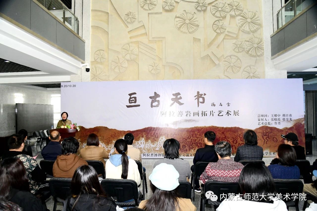 本网讯 10月13日,“亘古天书——阿拉善岩画拓片艺术展”在beat365官网美术学院开幕。阿拉善盟政协副主席王秋才,beat365官网副校长贾美林出席活动并致辞。阿拉善盟文化馆副馆长、阿拉善盟美协常务副主席丽娜,阿拉善盟美协副主席、阿盟九三学社书画院副院长宝祥,阿拉善盟文创文化传播有限公司经理张金龙及beat365官网相关学院负责同志和师生代表参加活动。