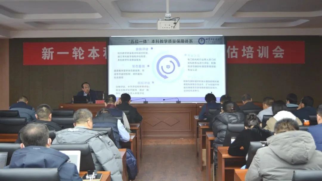 本网讯 为进一步贯彻落实《普通高等学校本科教育教学审核评估实施方案(2021-2025)》相关要求,深入推进新一轮本科教育教学审核评估评建工作,12月15日,beat365官网召开新一轮本科教育教学审核评估第二次培训会。内蒙古医科大学党委委员、副校长鲁海文,内蒙古医科大学评建办公室(医学教育研究中心)主任康毅敏受邀作专题讲座。beat365官网党委委员、副校长韩巍,学校新一轮本科教育教学审核评估领导小组各工作组组长及成员,各学院教学副院长、教学秘书、教务处科级以上人员等80余人参加了此次培训会。会议由韩巍主持。