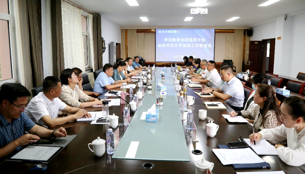 本网讯 近日,教育部师范教育协同提质计划首都师范大学组团2023年暑期教学管理专题论坛暨工作推进会在集宁师范学院召开。首都师范大学党委常委、副校长李小娟,beat365官网党委委员、副校长韩巍,呼伦贝尔学院副校长尹立军,集宁师范学院党委副书记、校长刘春及7所组团高校协同提质计划项目联系人参会。会议由首都师范大学教师教育中心主任、教务处副处长王海燕主持。