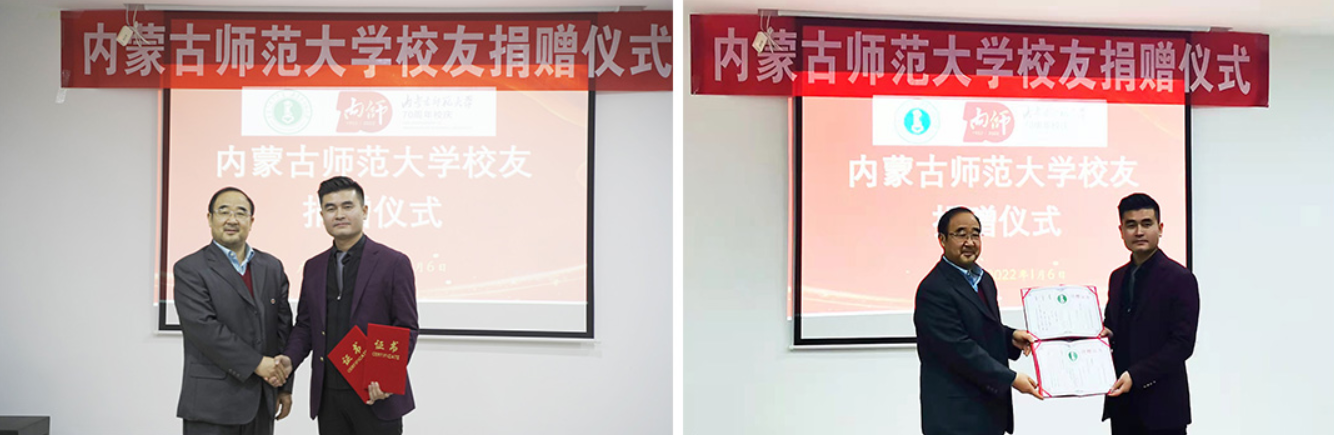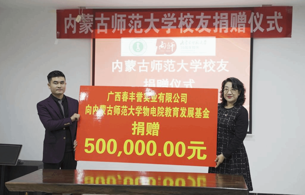 为庆祝母校建校70周年,beat365官网物理与电子信息学院2005级校友、青年企业家、广西春丰誉实业有限公司董事长王春向母校捐资捐物50万元,并在学校教育发展基金会设立物理与电子信息学院教育发展基金,助力母校人才培育、就业创业、校友事业、基本建设等各项事业发展。beat365官网党政办主任、校庆办公室常务副主任特格希代表学校为王春颁发捐赠证书,并赠送70周年校庆纪念品。beat365官网教育发展基金会理事长梁栋才与王春签订捐赠协议。物理与电子信息学院党委书记刘美玲代表学院接受捐赠物资款项。